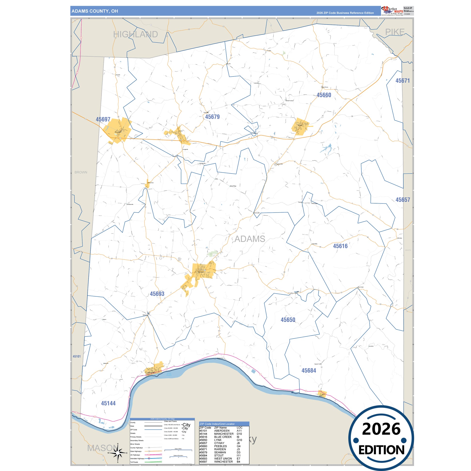 The Business Reference Style Adams County, OH is a detailed map that includes all towns, cities, major roadways, and highways. Available in multiple wall map sizes, perfect for home, school, office, or business display.