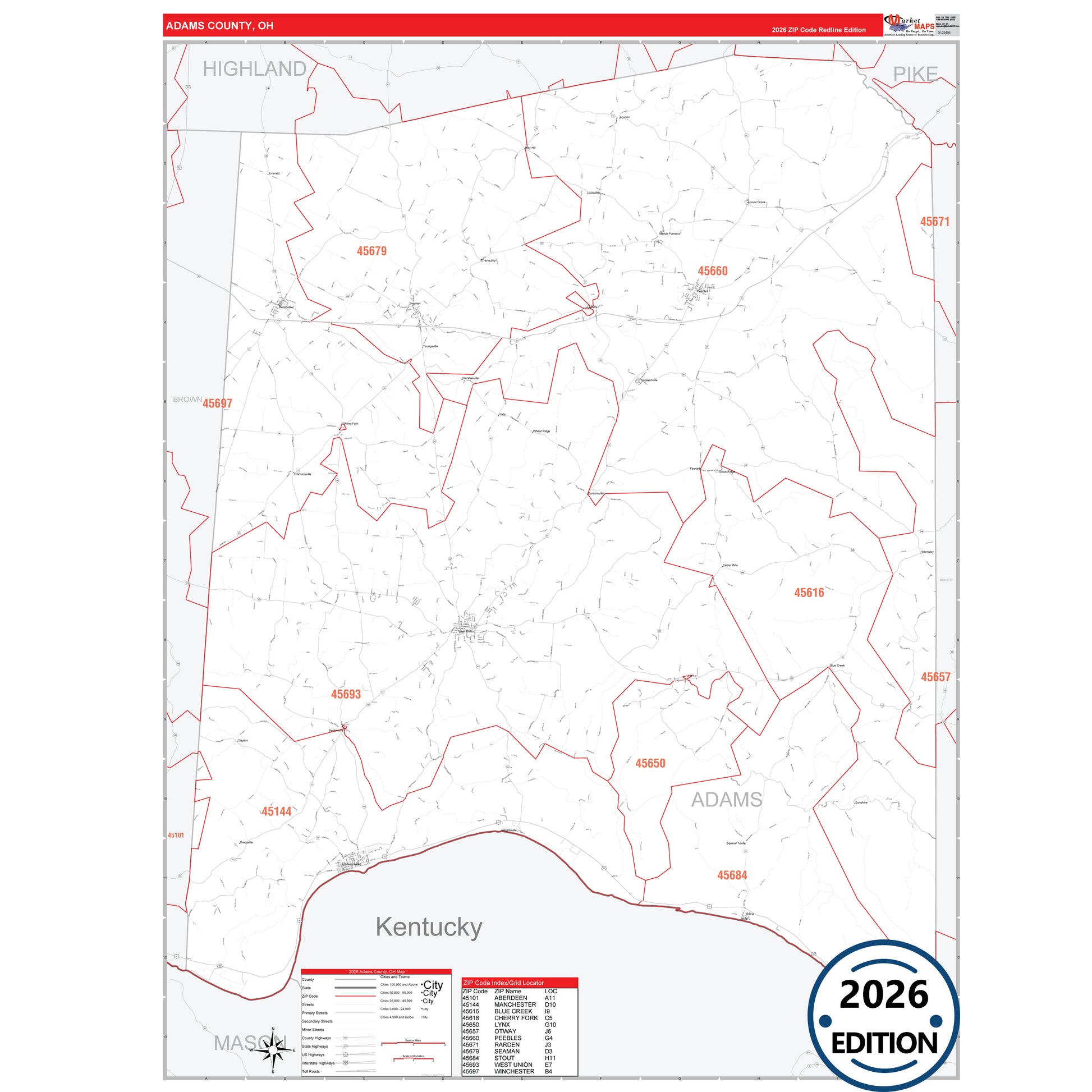 The RedLine Style map of Adams County, OH shows ZIP code areas overlaid on a detailed road network of Adams County, Ohio. Ideal for drawing locations, territories, and other applications. Base map features include all major streets and highways labeled, cities and towns, county and state boundaries, neighborhood names, railroads, and a clean white background suitable for marking and planning.