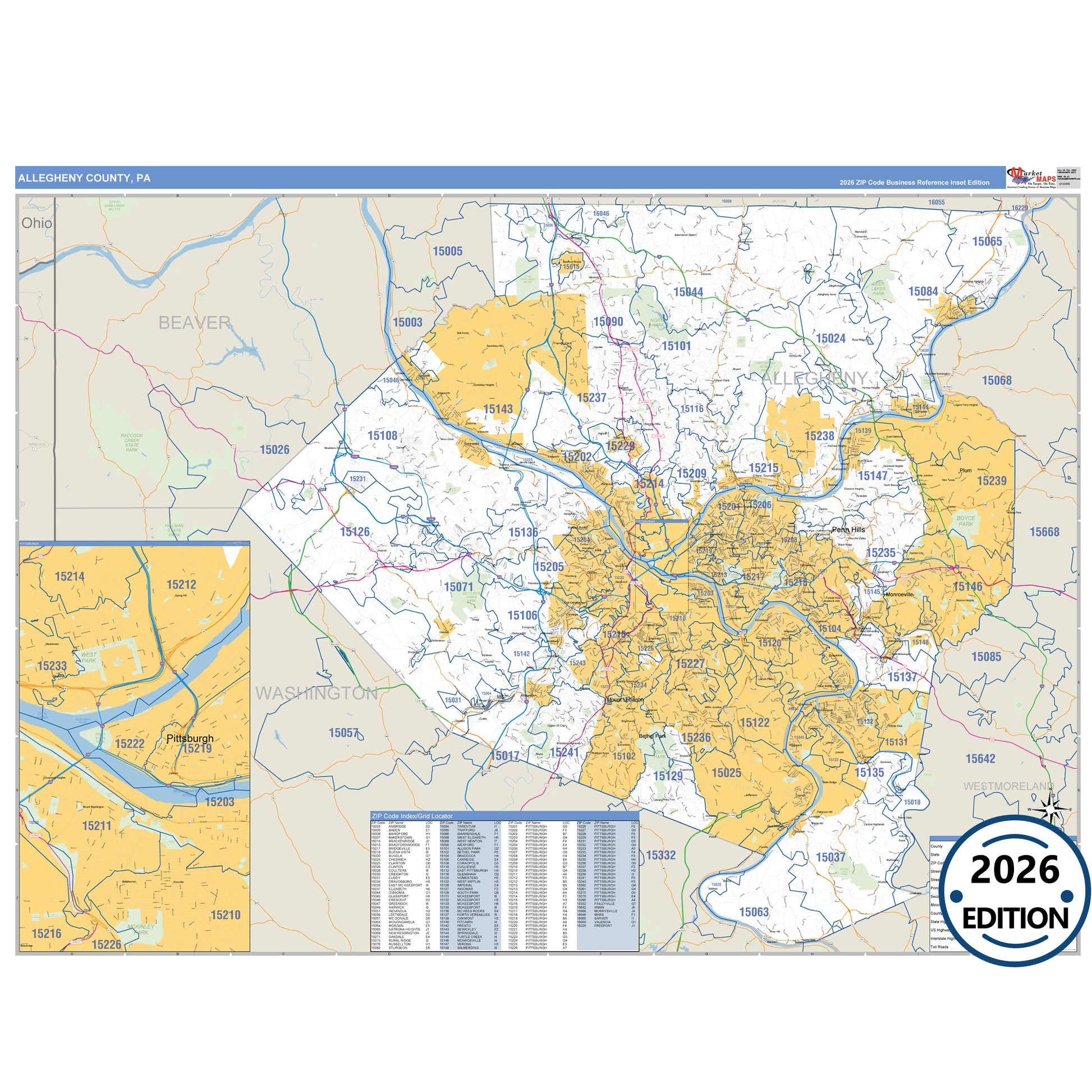 The Business Reference Style Allegheny County, PA is a detailed map that includes all towns, cities, major roadways, and highways. Available in multiple wall map sizes, perfect for home, school, office, or business display.