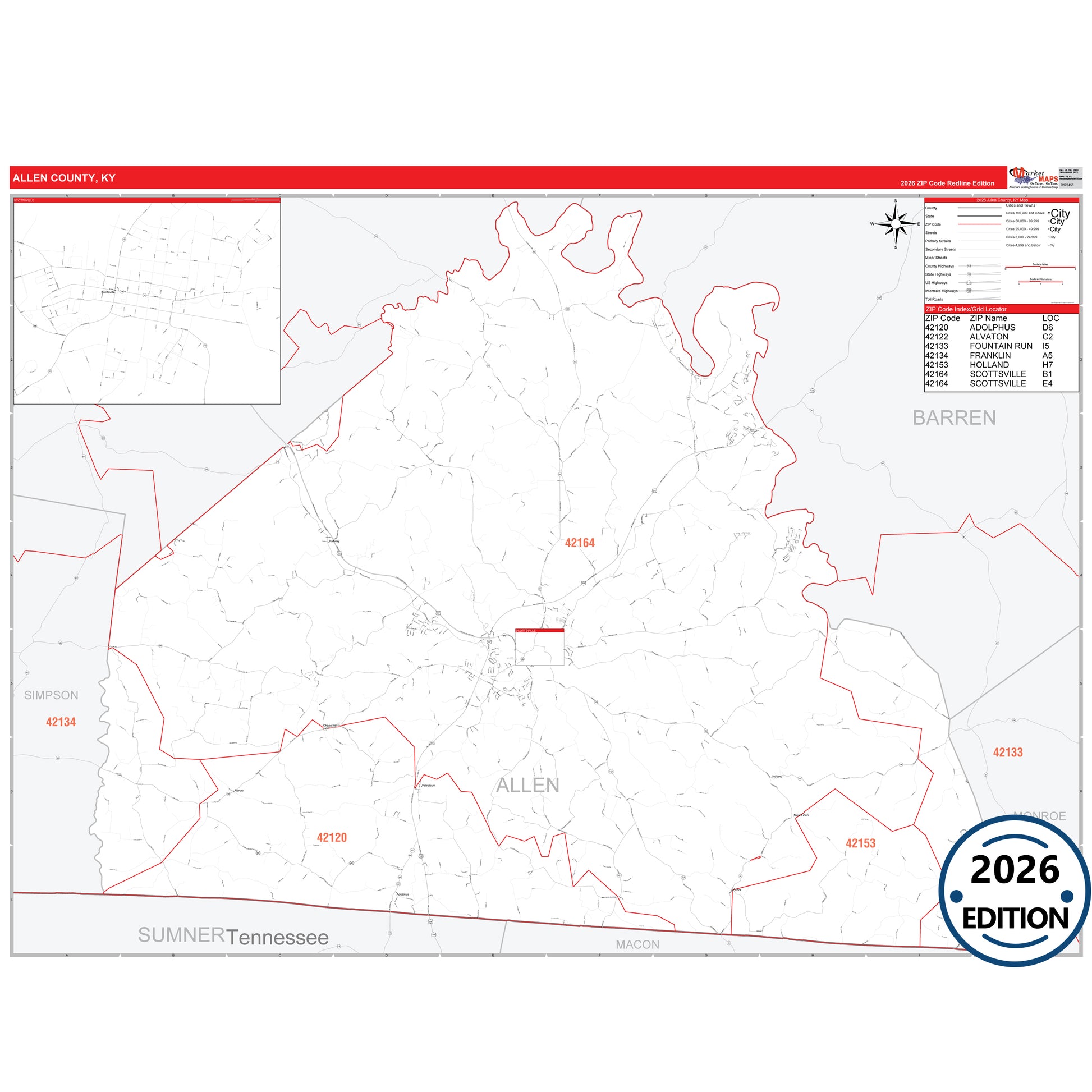 The RedLine Style map of Allen County, KY shows ZIP code areas overlaid on a detailed road network of Allen County, Kentucky. Ideal for drawing locations, territories, and other applications. Base map features include all major streets and highways labeled, cities and towns, county and state boundaries, neighborhood names, railroads, and a clean white background suitable for marking and planning.