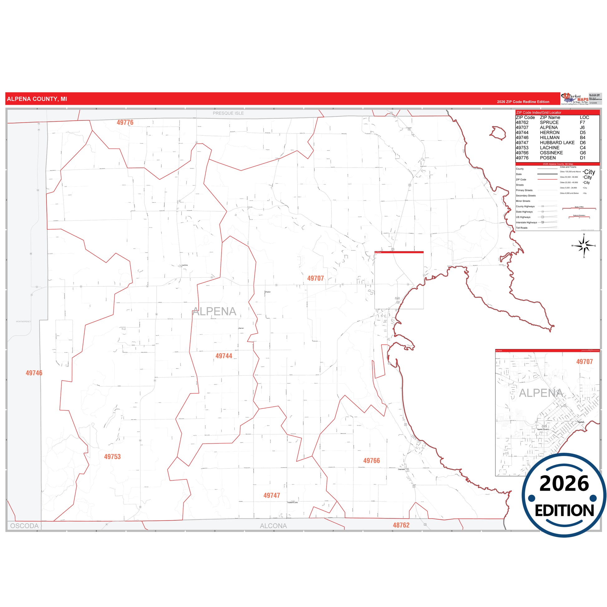 The RedLine Style map of Alpena County, MI shows ZIP code areas overlaid on a detailed road network of Alpena County, Michigan. Ideal for drawing locations, territories, and other applications. Base map features include all major streets and highways labeled, cities and towns, county and state boundaries, neighborhood names, railroads, and a clean white background suitable for marking and planning.