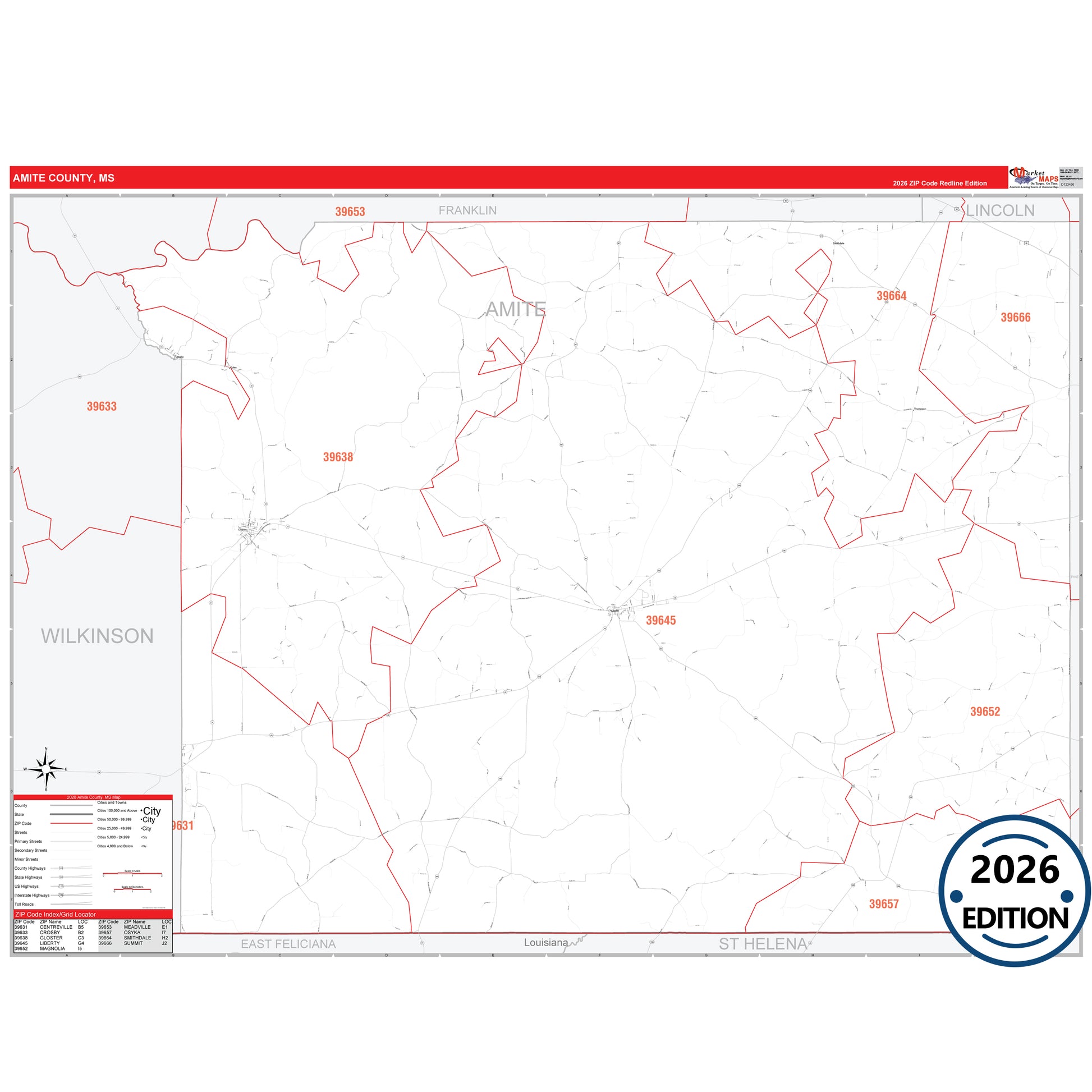 The RedLine Style map of Amite County, MS shows ZIP code areas overlaid on a detailed road network of Amite County, Mississippi. Ideal for drawing locations, territories, and other applications. Base map features include all major streets and highways labeled, cities and towns, county and state boundaries, neighborhood names, railroads, and a clean white background suitable for marking and planning.