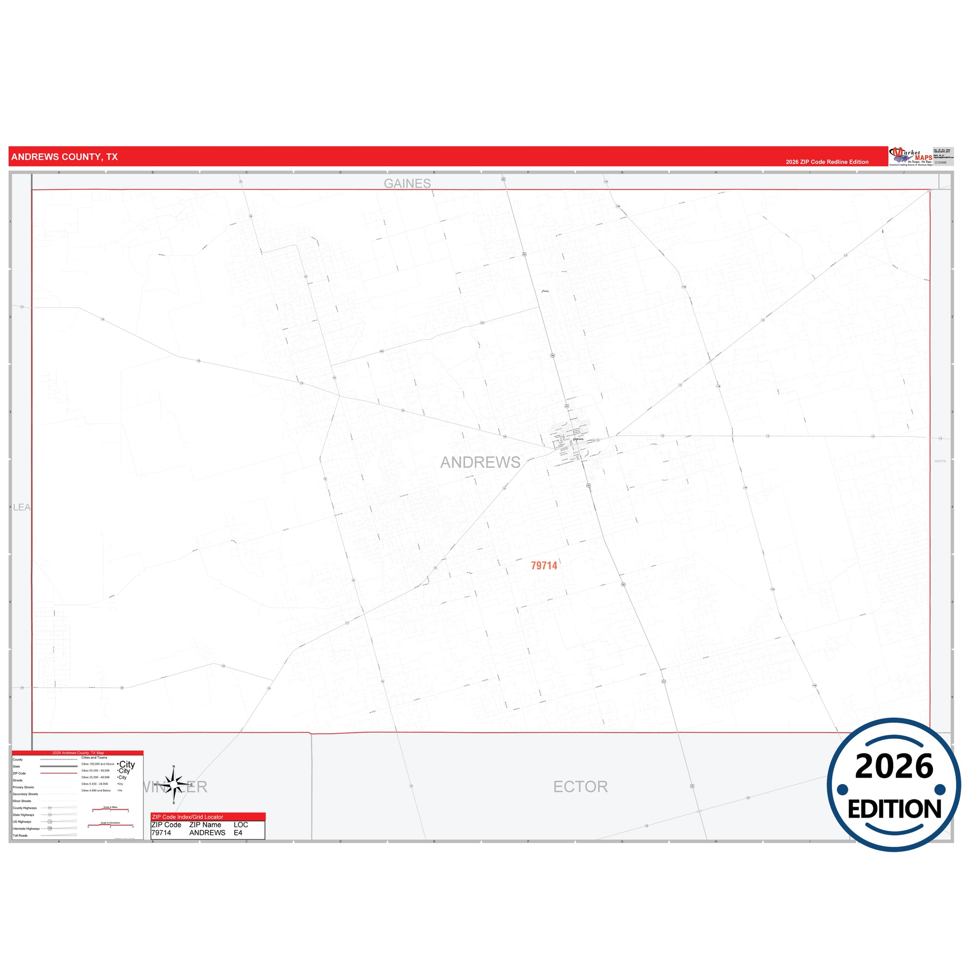 The RedLine Style map of Andrews County, TX shows ZIP code areas overlaid on a detailed road network of Andrews County, Texas. Ideal for drawing locations, territories, and other applications. Base map features include all major streets and highways labeled, cities and towns, county and state boundaries, neighborhood names, railroads, and a clean white background suitable for marking and planning.