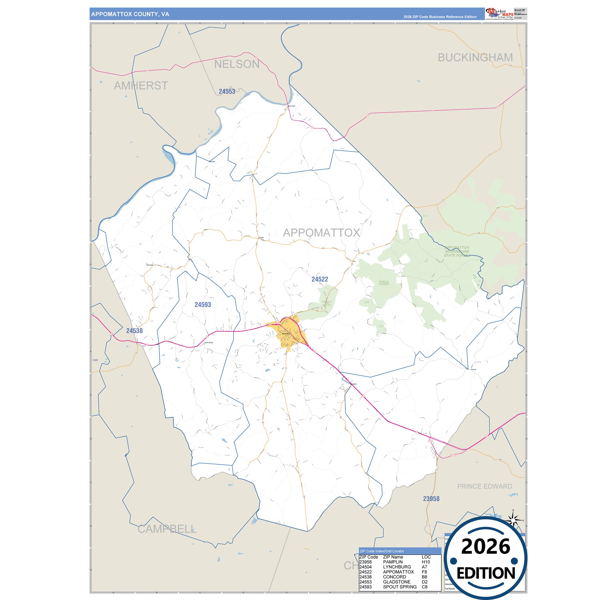 The Business Reference Style Appomattox County, VA is a detailed map that includes all towns, cities, major roadways, and highways. Available in multiple wall map sizes, perfect for home, school, office, or business display.