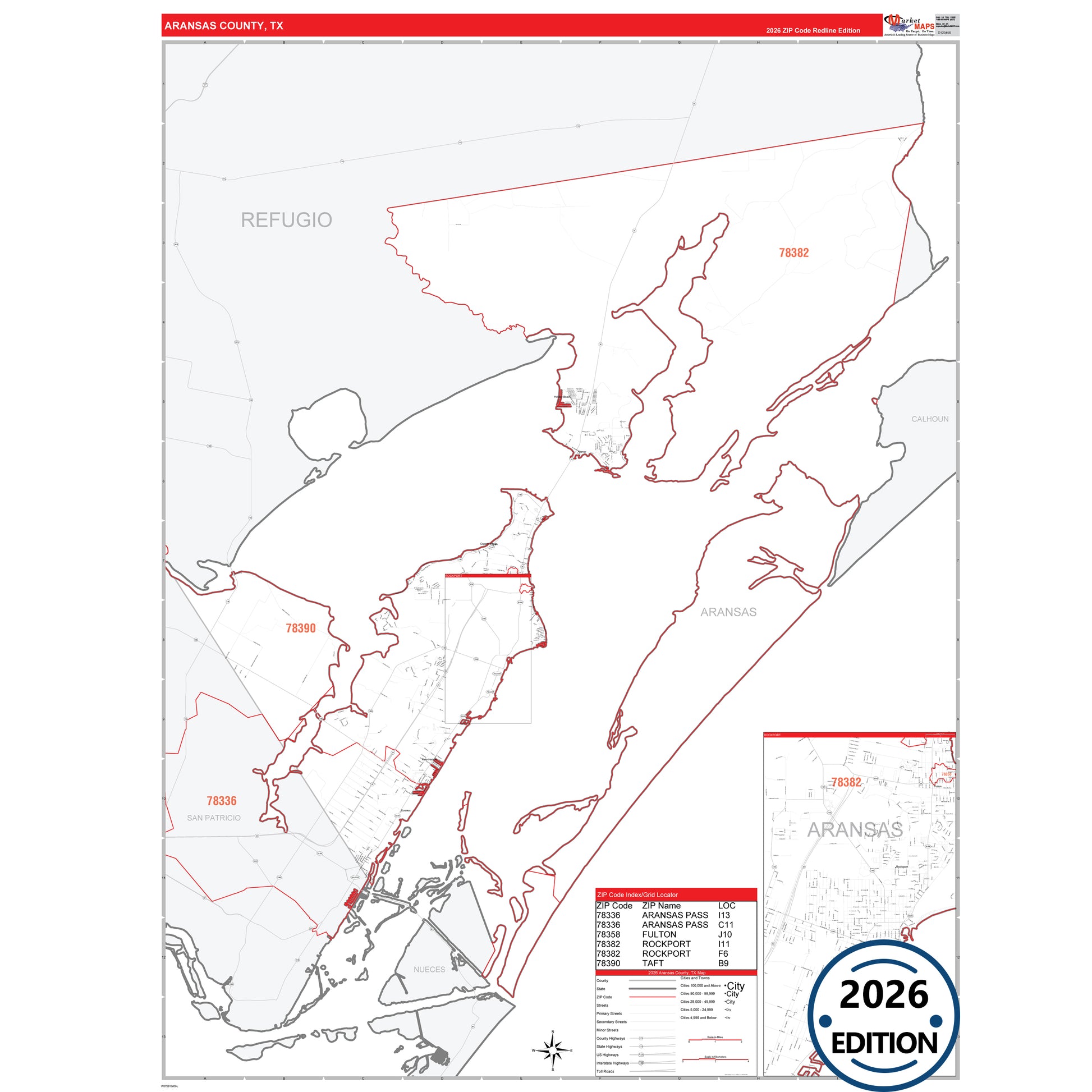 The RedLine Style map of Aransas County, TX shows ZIP code areas overlaid on a detailed road network of Aransas County, Texas. Ideal for drawing locations, territories, and other applications. Base map features include all major streets and highways labeled, cities and towns, county and state boundaries, neighborhood names, railroads, and a clean white background suitable for marking and planning.