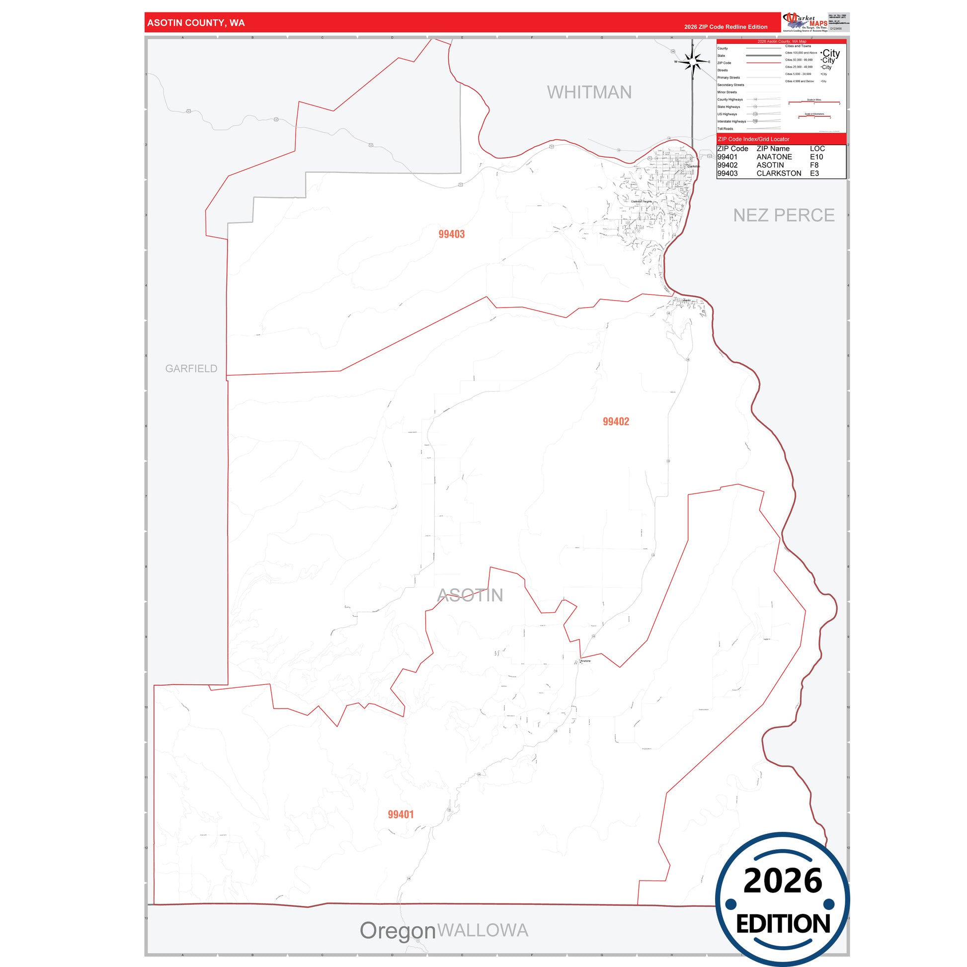 The RedLine Style map of Asotin County, WA shows ZIP code areas overlaid on a detailed road network of Asotin County, Washington. Ideal for drawing locations, territories, and other applications. Base map features include all major streets and highways labeled, cities and towns, county and state boundaries, neighborhood names, railroads, and a clean white background suitable for marking and planning.