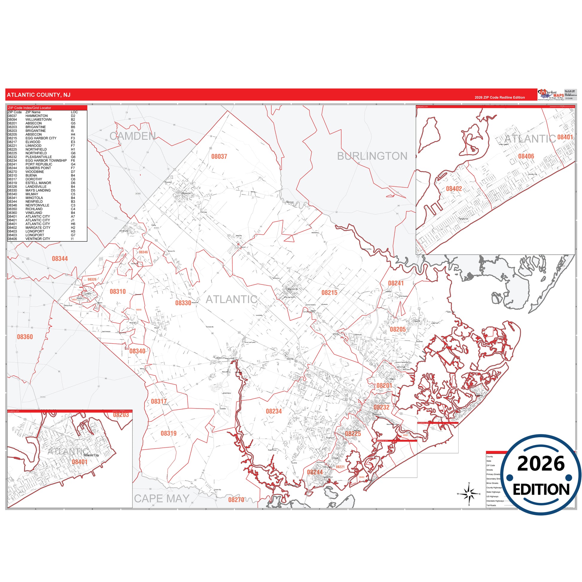 The RedLine Style map of Atlantic County, NJ shows ZIP code areas overlaid on a detailed road network of Atlantic County, New Jersey. Ideal for drawing locations, territories, and other applications. Base map features include all major streets and highways labeled, cities and towns, county and state boundaries, neighborhood names, railroads, and a clean white background suitable for marking and planning.