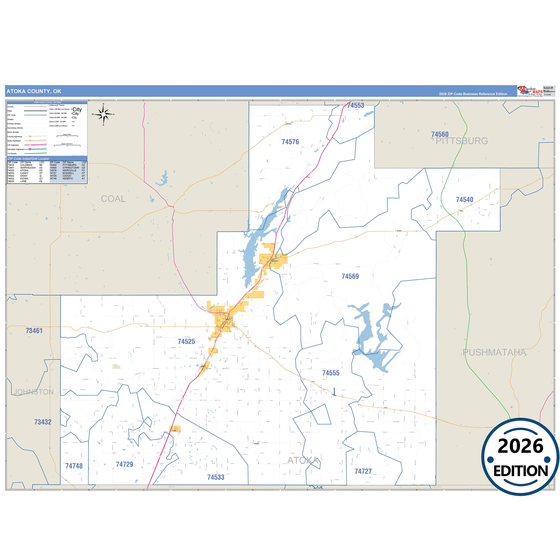 The Business Reference Style Atoka County, OK is a detailed map that includes all towns, cities, major roadways, and highways. Available in multiple wall map sizes, perfect for home, school, office, or business display.