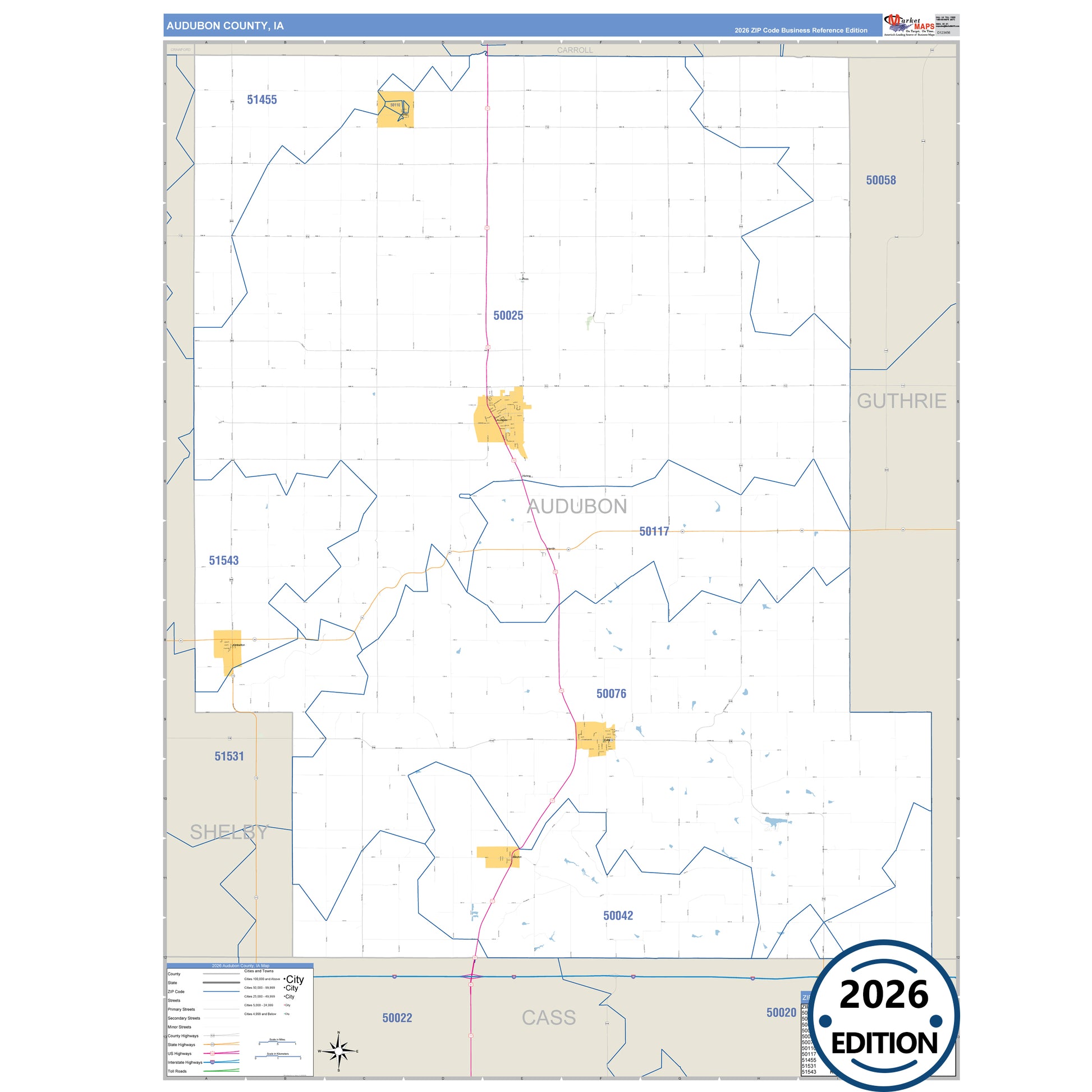 The Business Reference Style Audubon County, IA is a detailed map that includes all towns, cities, major roadways, and highways. Available in multiple wall map sizes, perfect for home, school, office, or business display.
