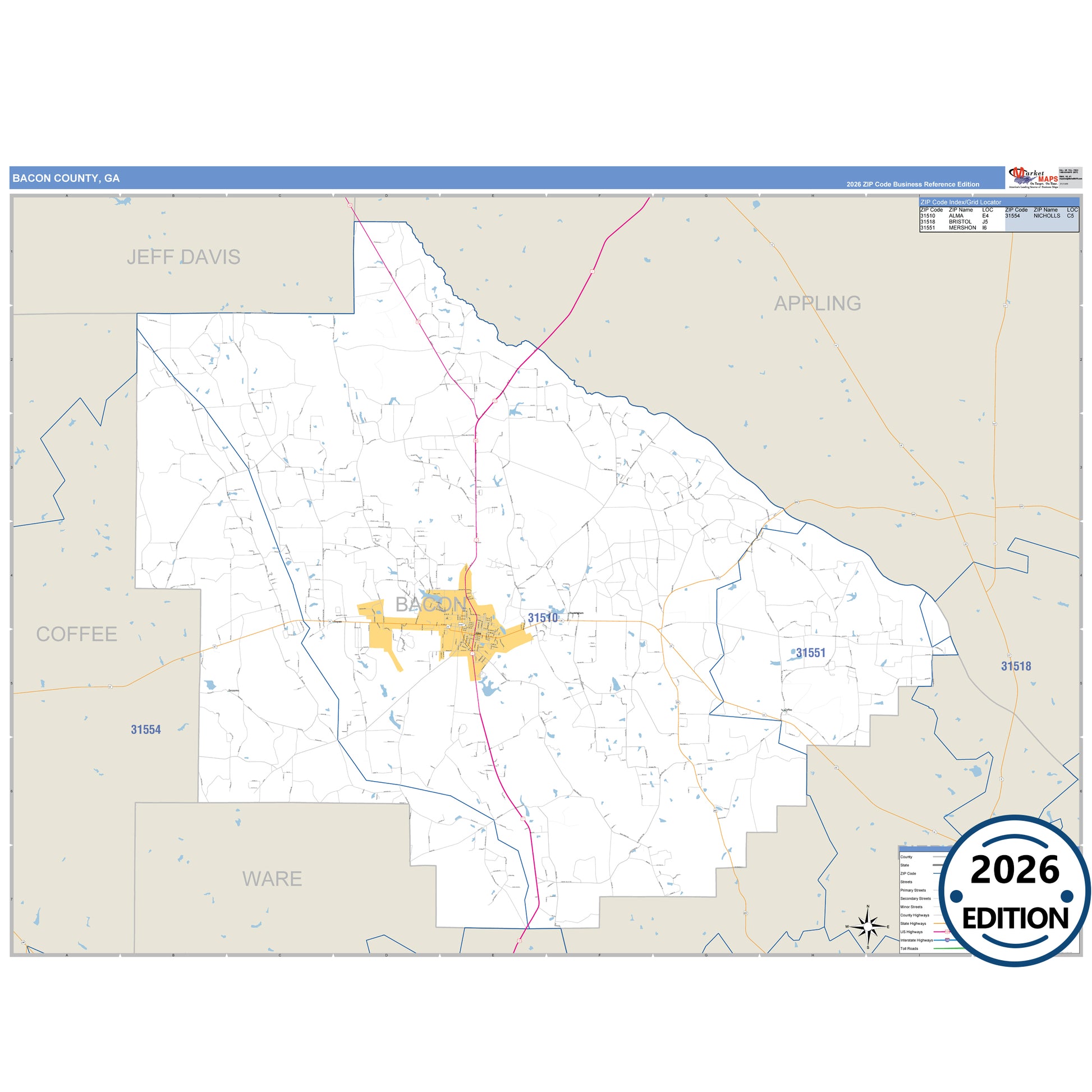 The Business Reference Style Bacon County, GA is a detailed map that includes all towns, cities, major roadways, and highways. Available in multiple wall map sizes, perfect for home, school, office, or business display.