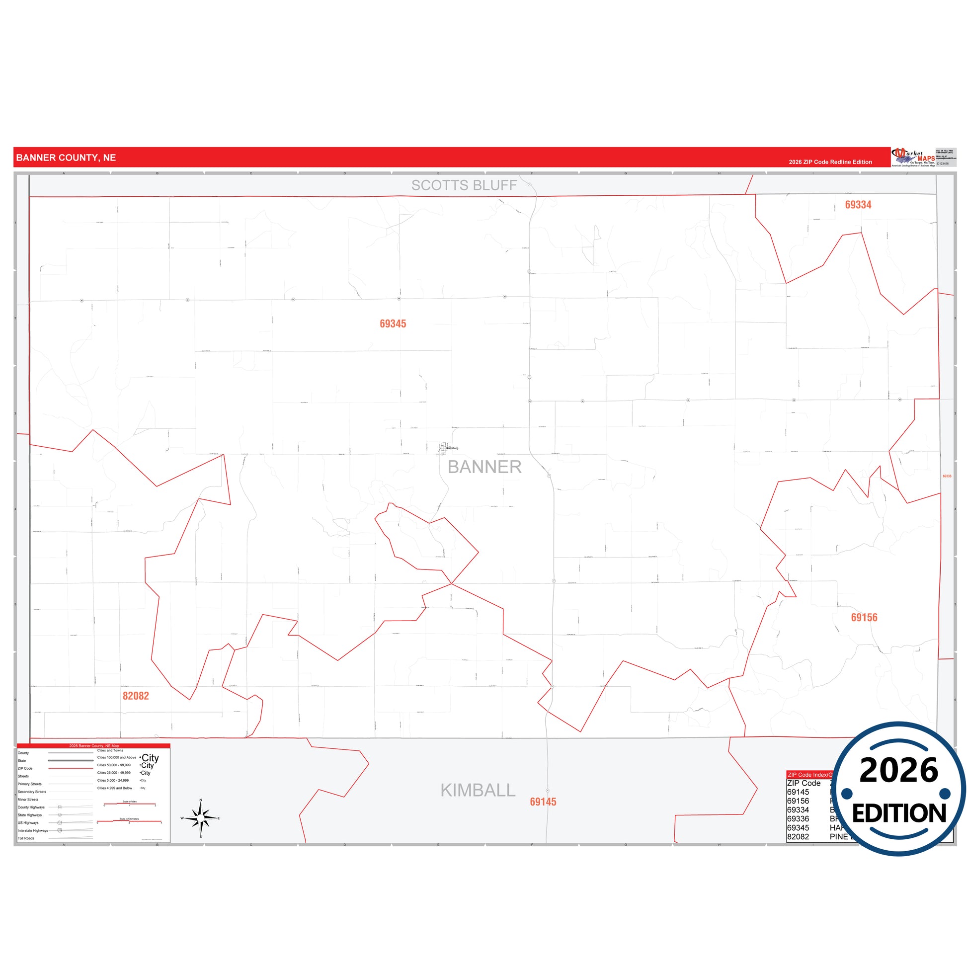 The RedLine Style map of Banner County, NE shows ZIP code areas overlaid on a detailed road network of Banner County, Nebraska. Ideal for drawing locations, territories, and other applications. Base map features include all major streets and highways labeled, cities and towns, county and state boundaries, neighborhood names, railroads, and a clean white background suitable for marking and planning.