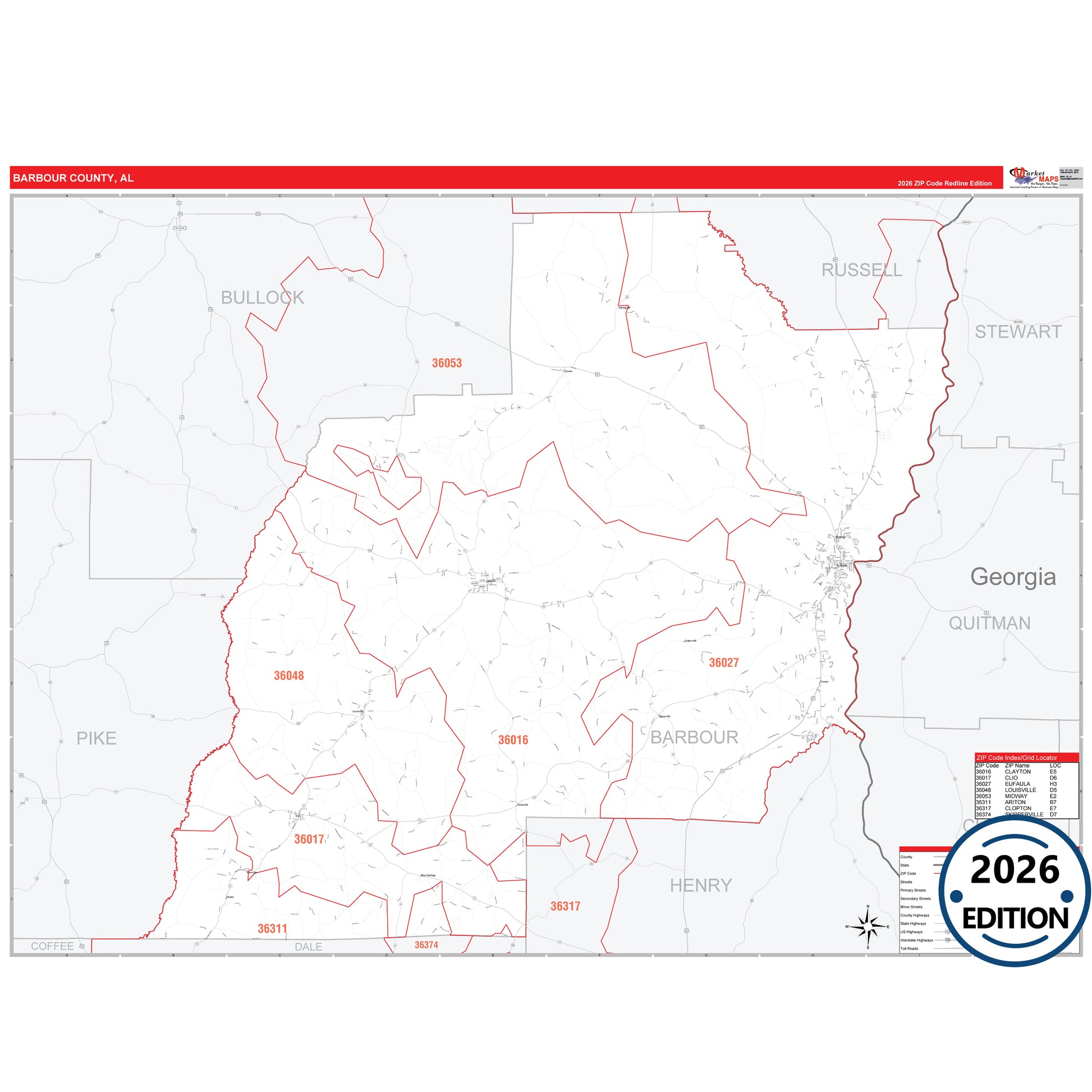 The RedLine Style map of Barbour County, AL shows ZIP code areas overlaid on a detailed road network of Barbour County, Alabama. Ideal for drawing locations, territories, and other applications. Base map features include all major streets and highways labeled, cities and towns, county and state boundaries, neighborhood names, railroads, and a clean white background suitable for marking and planning.