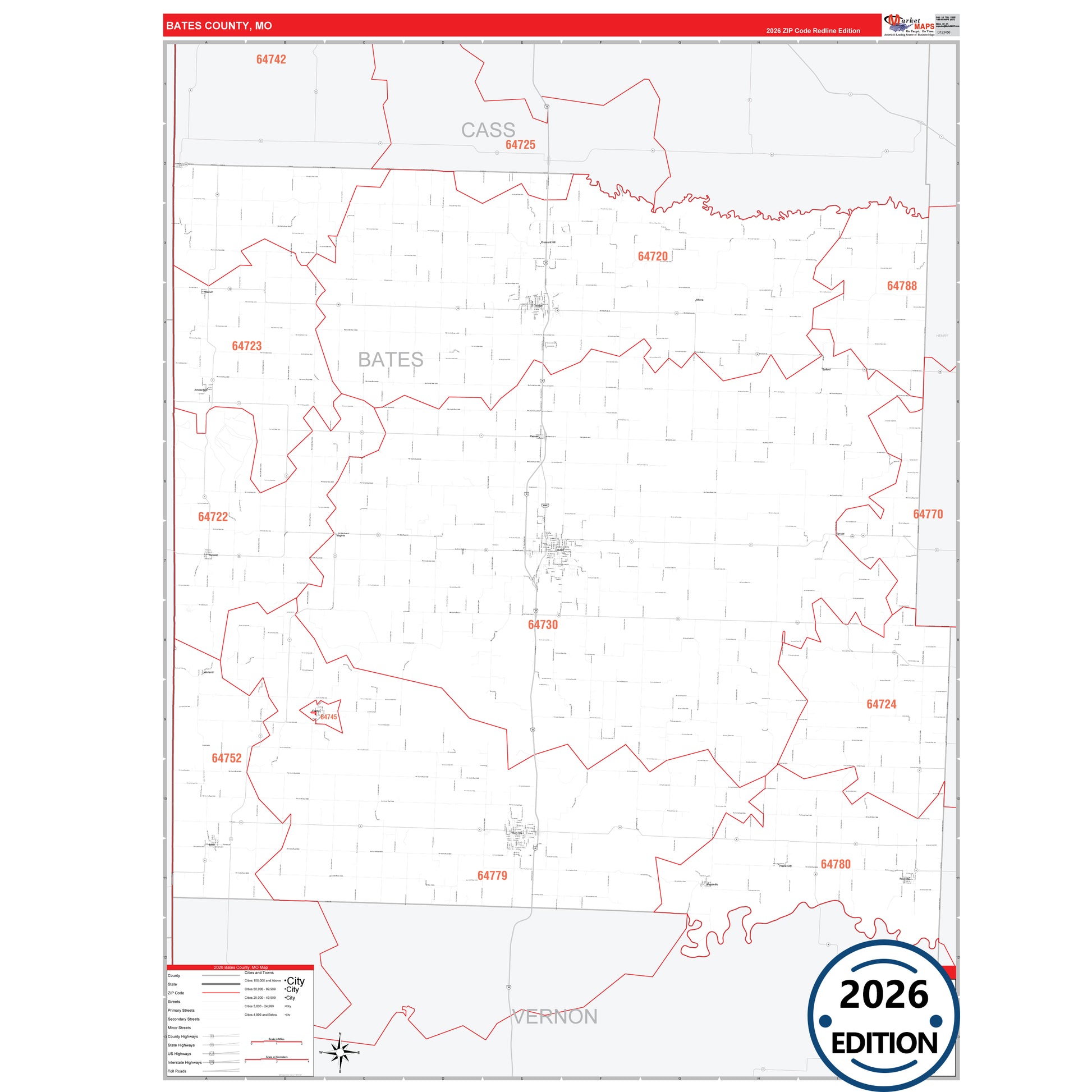 The RedLine Style map of Bates County, MO shows ZIP code areas overlaid on a detailed road network of Bates County, Missouri. Ideal for drawing locations, territories, and other applications. Base map features include all major streets and highways labeled, cities and towns, county and state boundaries, neighborhood names, railroads, and a clean white background suitable for marking and planning.
