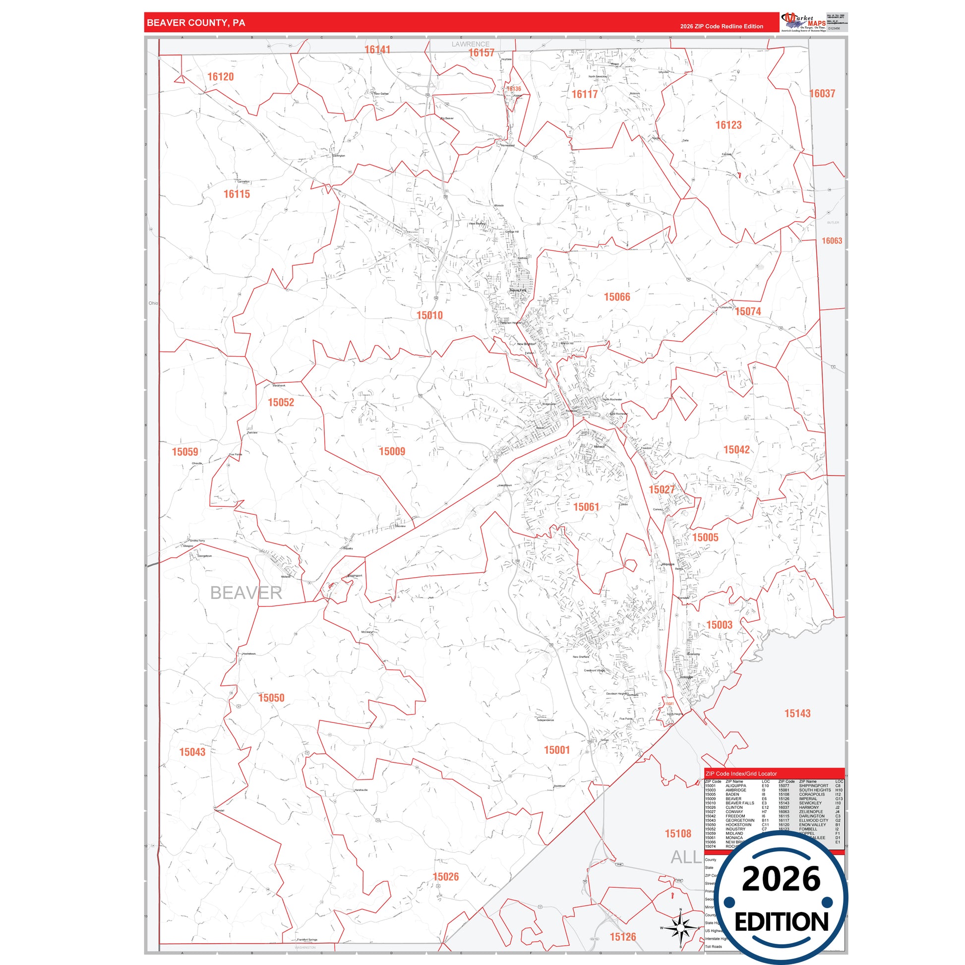 The RedLine Style map of Beaver County, PA shows ZIP code areas overlaid on a detailed road network of Beaver County, Pennsylvania. Ideal for drawing locations, territories, and other applications. Base map features include all major streets and highways labeled, cities and towns, county and state boundaries, neighborhood names, railroads, and a clean white background suitable for marking and planning.