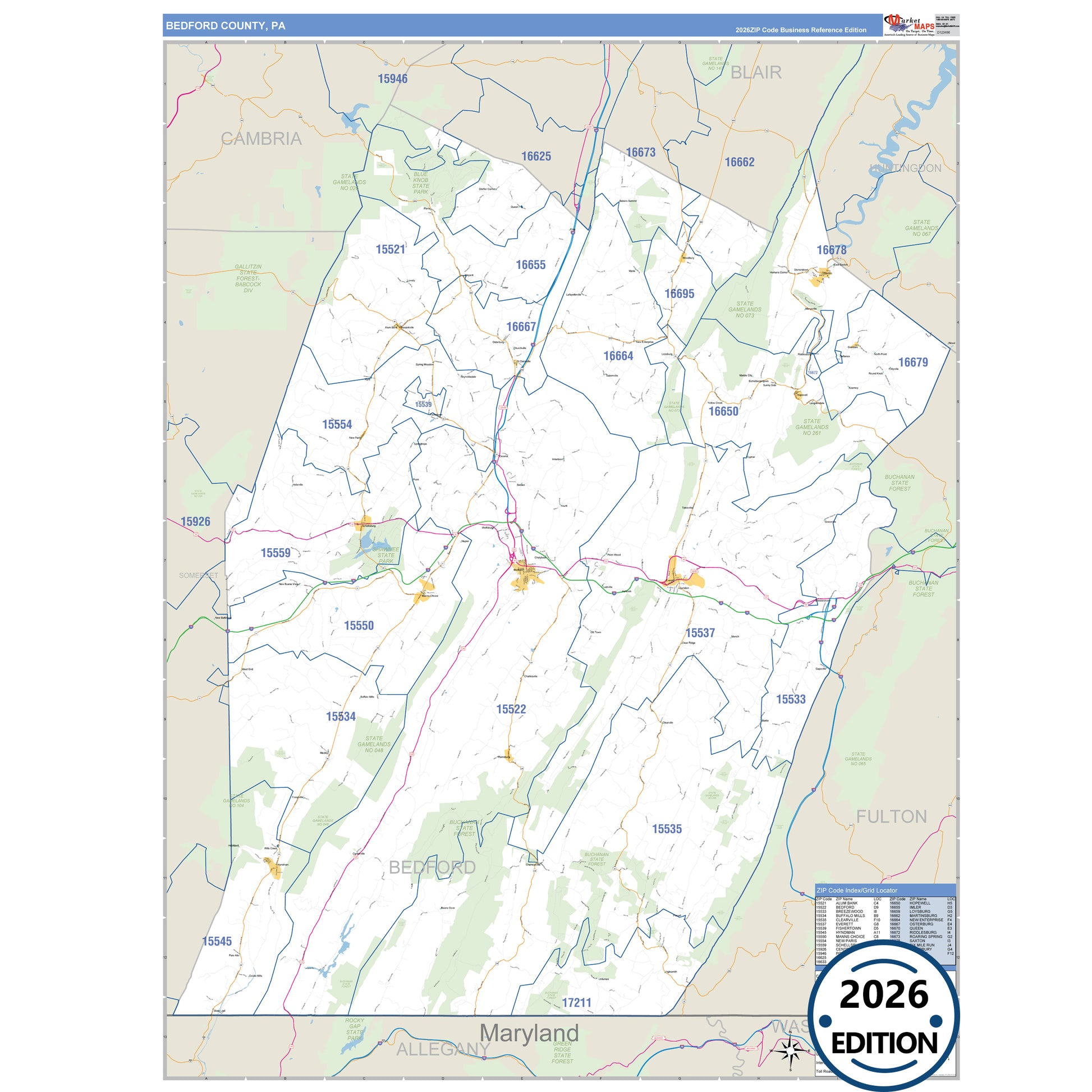 The Business Reference Style Bedford County, PA is a detailed map that includes all towns, cities, major roadways, and highways. Available in multiple wall map sizes, perfect for home, school, office, or business display.