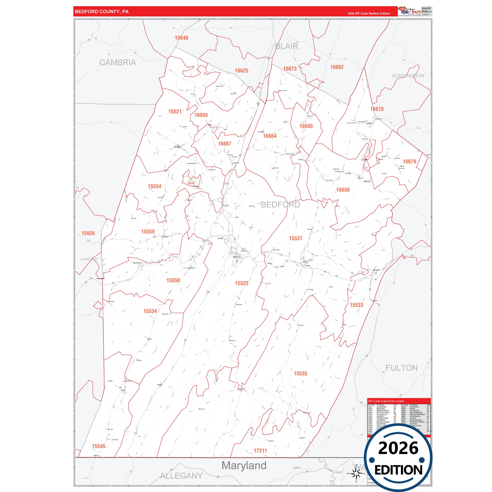 The RedLine Style map of Bedford County, PA shows ZIP code areas overlaid on a detailed road network of Bedford County, Pennsylvania. Ideal for drawing locations, territories, and other applications. Base map features include all major streets and highways labeled, cities and towns, county and state boundaries, neighborhood names, railroads, and a clean white background suitable for marking and planning.