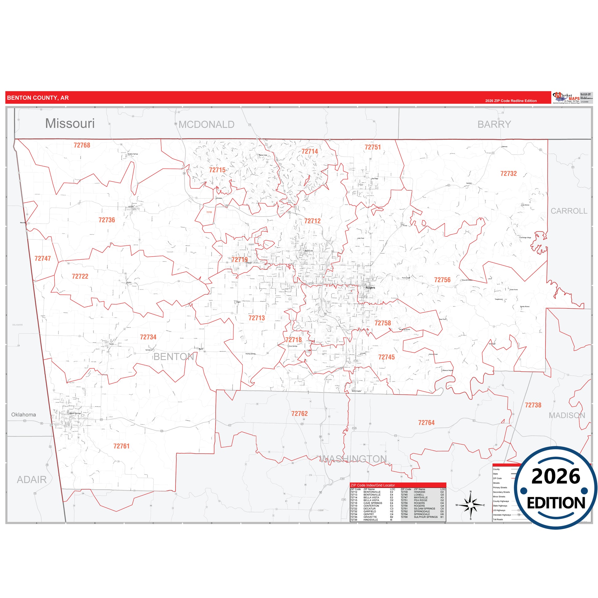 The RedLine Style map of Benton County, AR shows ZIP code areas overlaid on a detailed road network of Benton County, Arkansas. Ideal for drawing locations, territories, and other applications. Base map features include all major streets and highways labeled, cities and towns, county and state boundaries, neighborhood names, railroads, and a clean white background suitable for marking and planning.