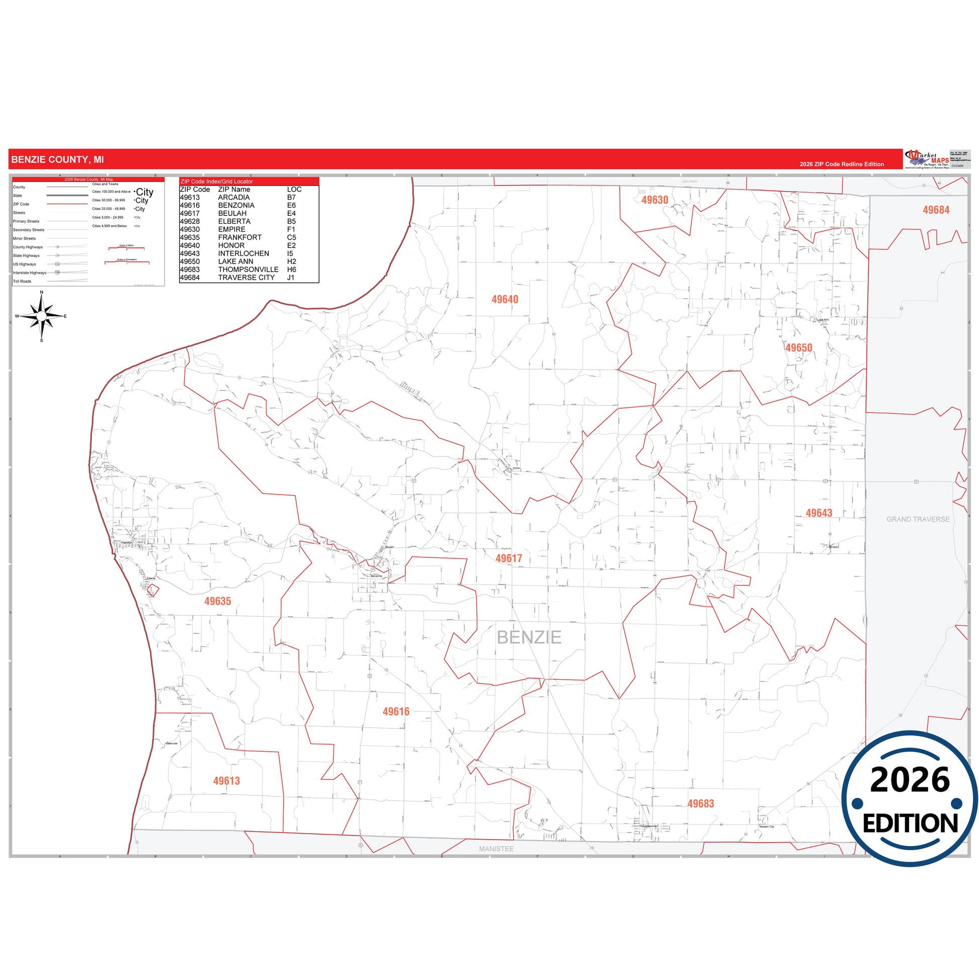 The RedLine Style map of Benzie County, MI shows ZIP code areas overlaid on a detailed road network of Benzie County, Michigan. Ideal for drawing locations, territories, and other applications. Base map features include all major streets and highways labeled, cities and towns, county and state boundaries, neighborhood names, railroads, and a clean white background suitable for marking and planning.