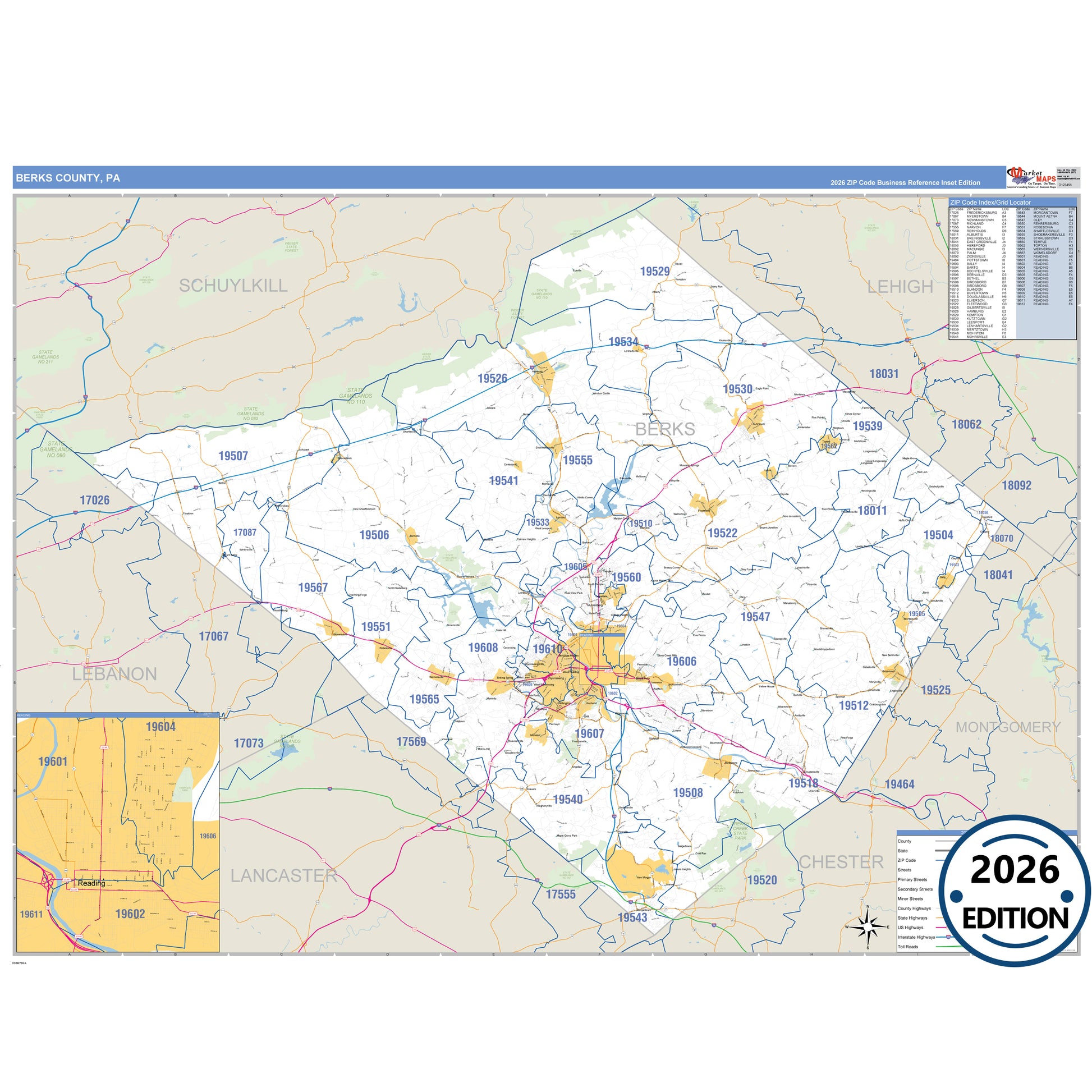 The Business Reference Style Berks County, PA is a detailed map that includes all towns, cities, major roadways, and highways. Available in multiple wall map sizes, perfect for home, school, office, or business display.