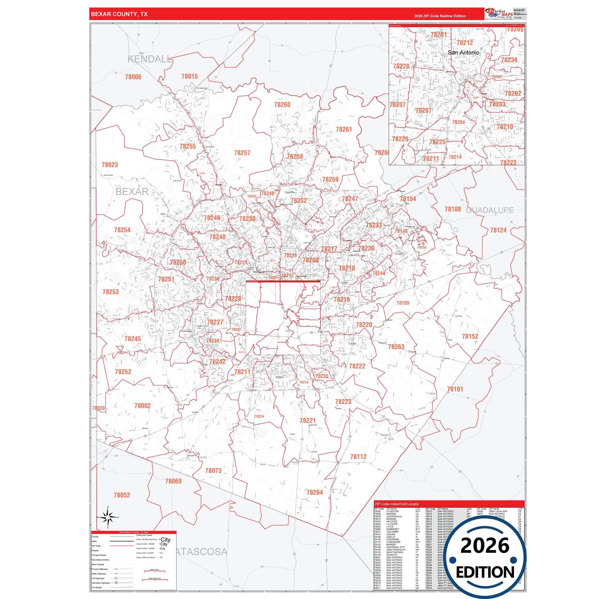 The RedLine Style map of Bexar County, TX shows ZIP code areas overlaid on a detailed road network of Bexar County, Texas. Ideal for drawing locations, territories, and other applications. Base map features include all major streets and highways labeled, cities and towns, county and state boundaries, neighborhood names, railroads, and a clean white background suitable for marking and planning.