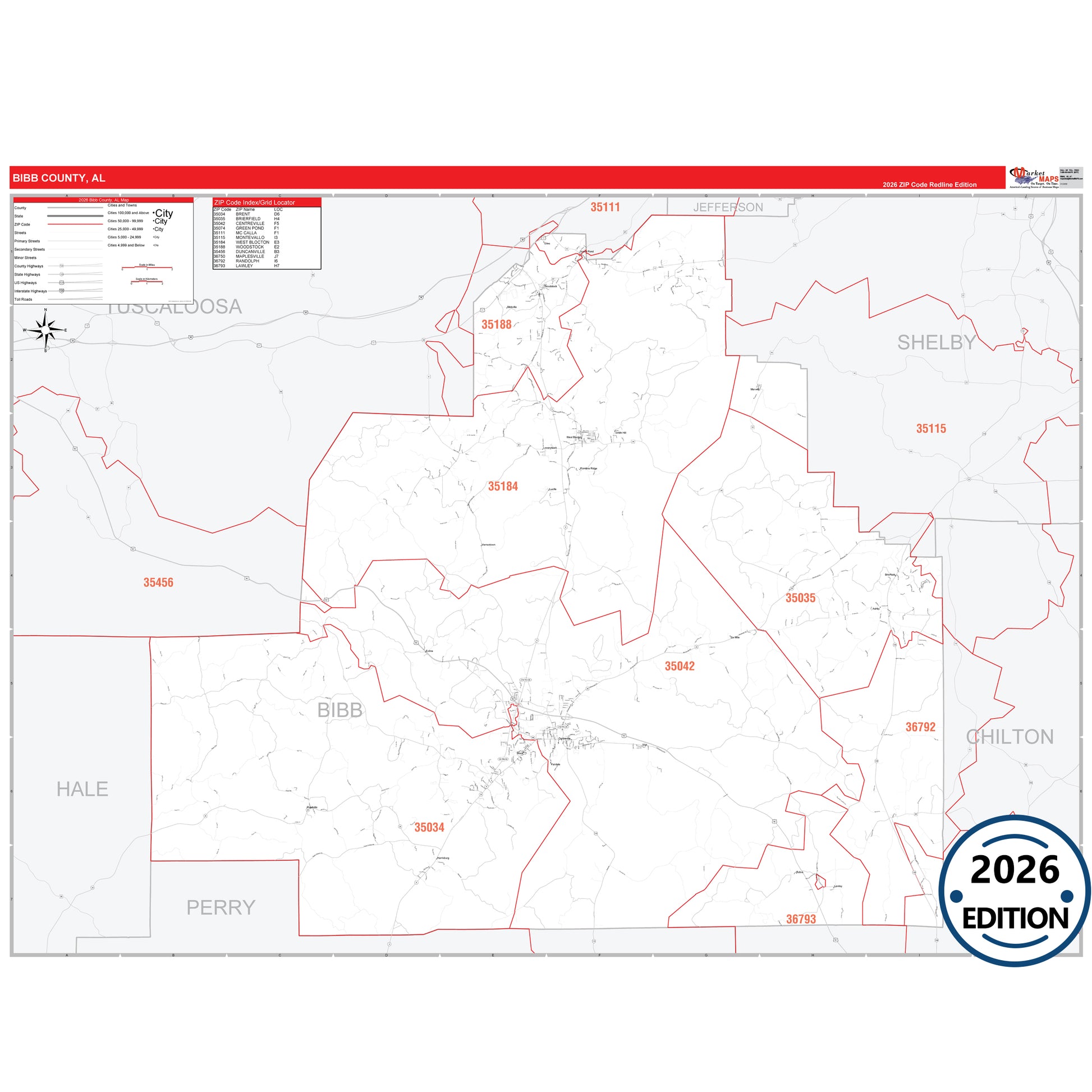The RedLine Style map of Bibb County, AL shows ZIP code areas overlaid on a detailed road network of Bibb County, Alabama. Ideal for drawing locations, territories, and other applications. Base map features include all major streets and highways labeled, cities and towns, county and state boundaries, neighborhood names, railroads, and a clean white background suitable for marking and planning.