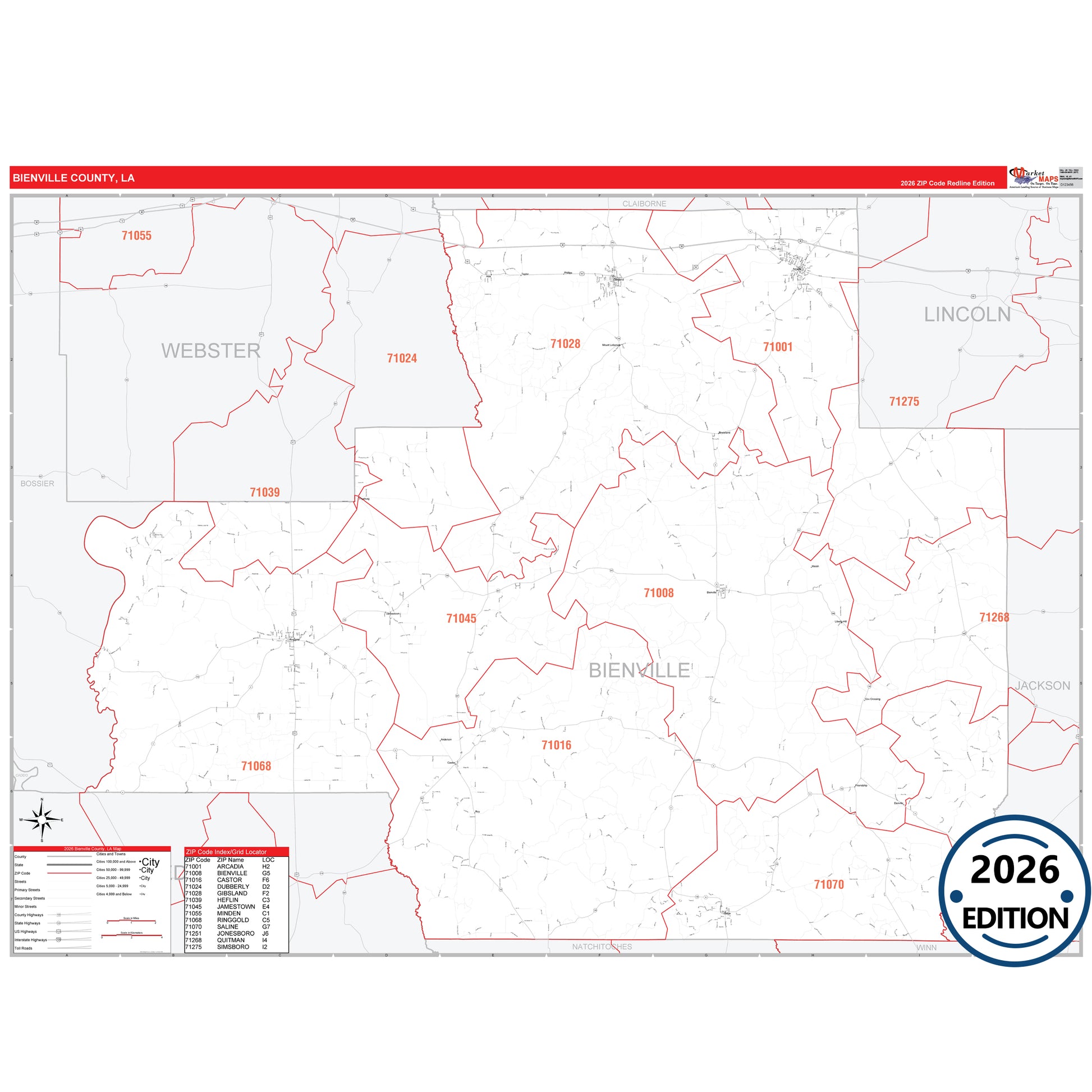 The RedLine Style map of Bienville County, LA shows ZIP code areas overlaid on a detailed road network of Bienville County, Louisiana. Ideal for drawing locations, territories, and other applications. Base map features include all major streets and highways labeled, cities and towns, county and state boundaries, neighborhood names, railroads, and a clean white background suitable for marking and planning.
