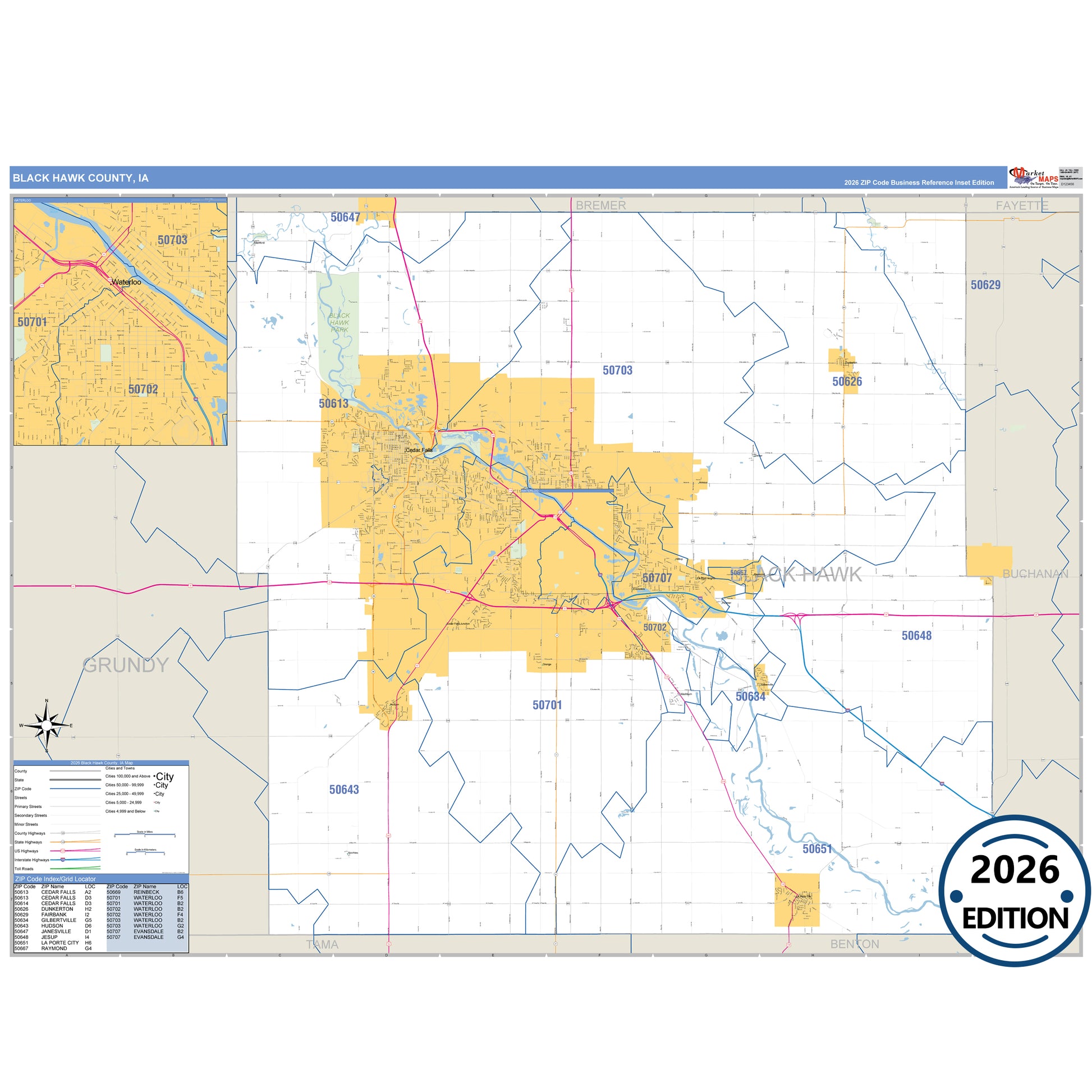 The Business Reference Style Black Hawk County, IA is a detailed map that includes all towns, cities, major roadways, and highways. Available in multiple wall map sizes, perfect for home, school, office, or business display.