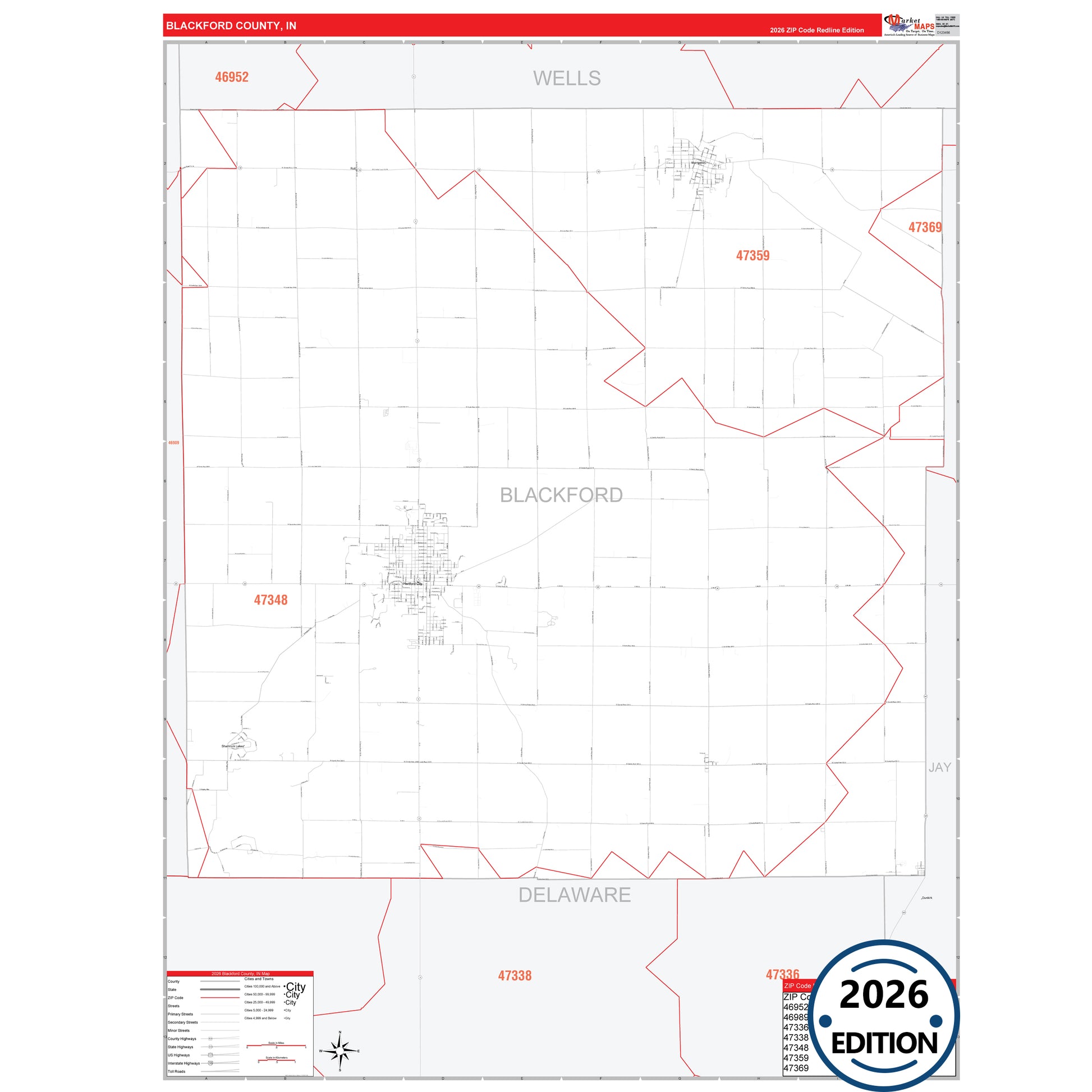 The RedLine Style map of Blackford County, IN shows ZIP code areas overlaid on a detailed road network of Blackford County, Indiana. Ideal for drawing locations, territories, and other applications. Base map features include all major streets and highways labeled, cities and towns, county and state boundaries, neighborhood names, railroads, and a clean white background suitable for marking and planning.