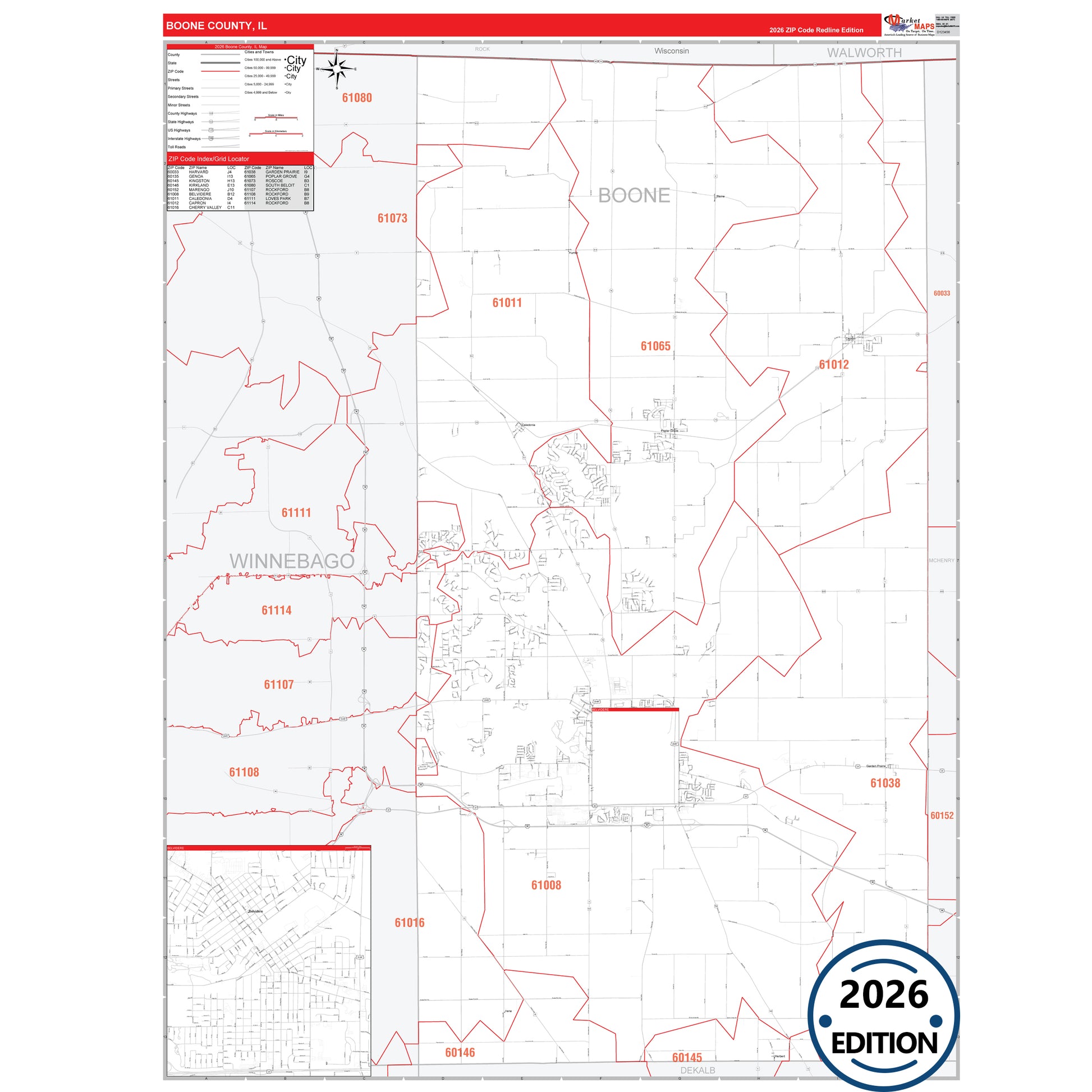 The RedLine Style map of Boone County, IL shows ZIP code areas overlaid on a detailed road network of Boone County, Illinois. Ideal for drawing locations, territories, and other applications. Base map features include all major streets and highways labeled, cities and towns, county and state boundaries, neighborhood names, railroads, and a clean white background suitable for marking and planning.