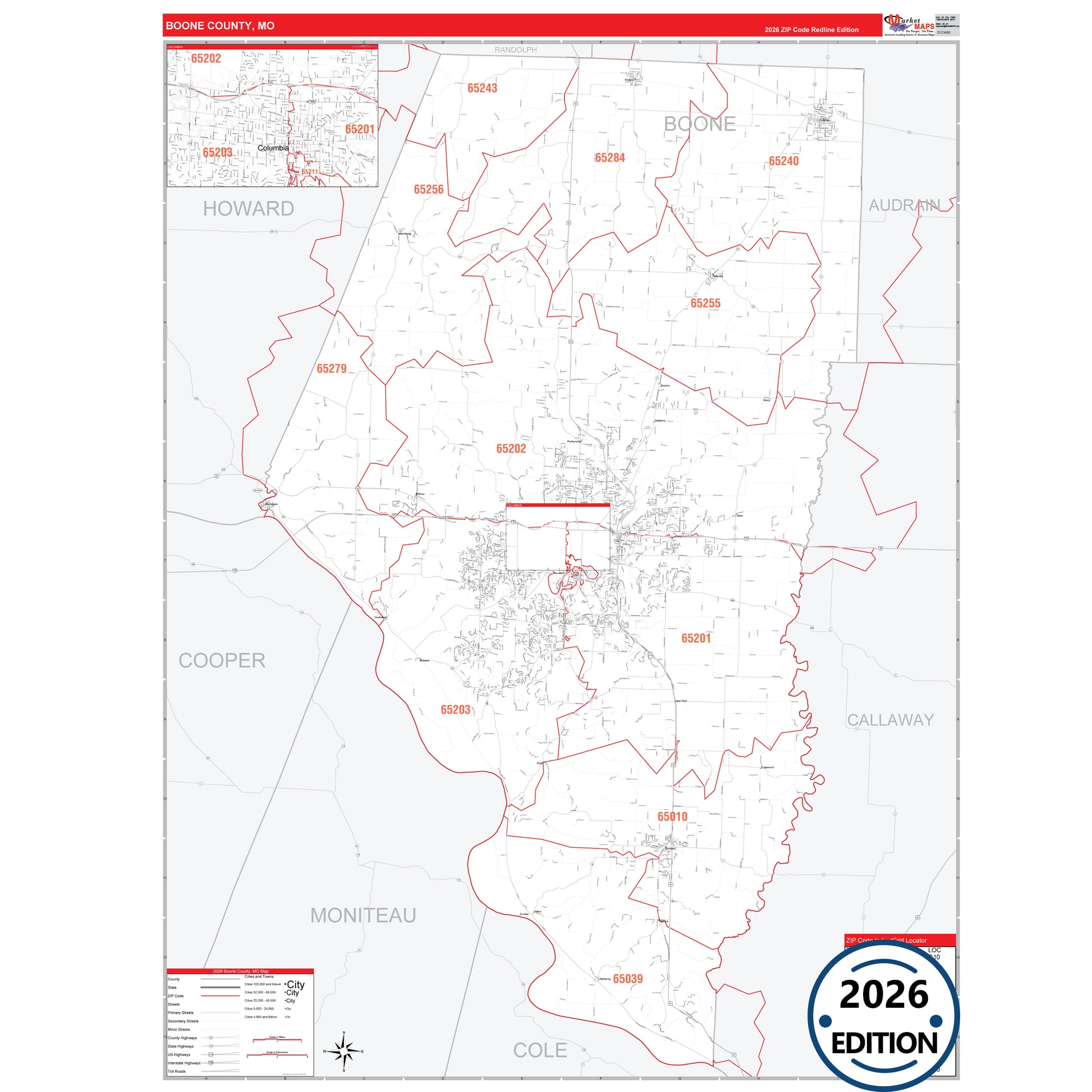 The RedLine Style map of Boone County, MO shows ZIP code areas overlaid on a detailed road network of Boone County, Missouri. Ideal for drawing locations, territories, and other applications. Base map features include all major streets and highways labeled, cities and towns, county and state boundaries, neighborhood names, railroads, and a clean white background suitable for marking and planning.