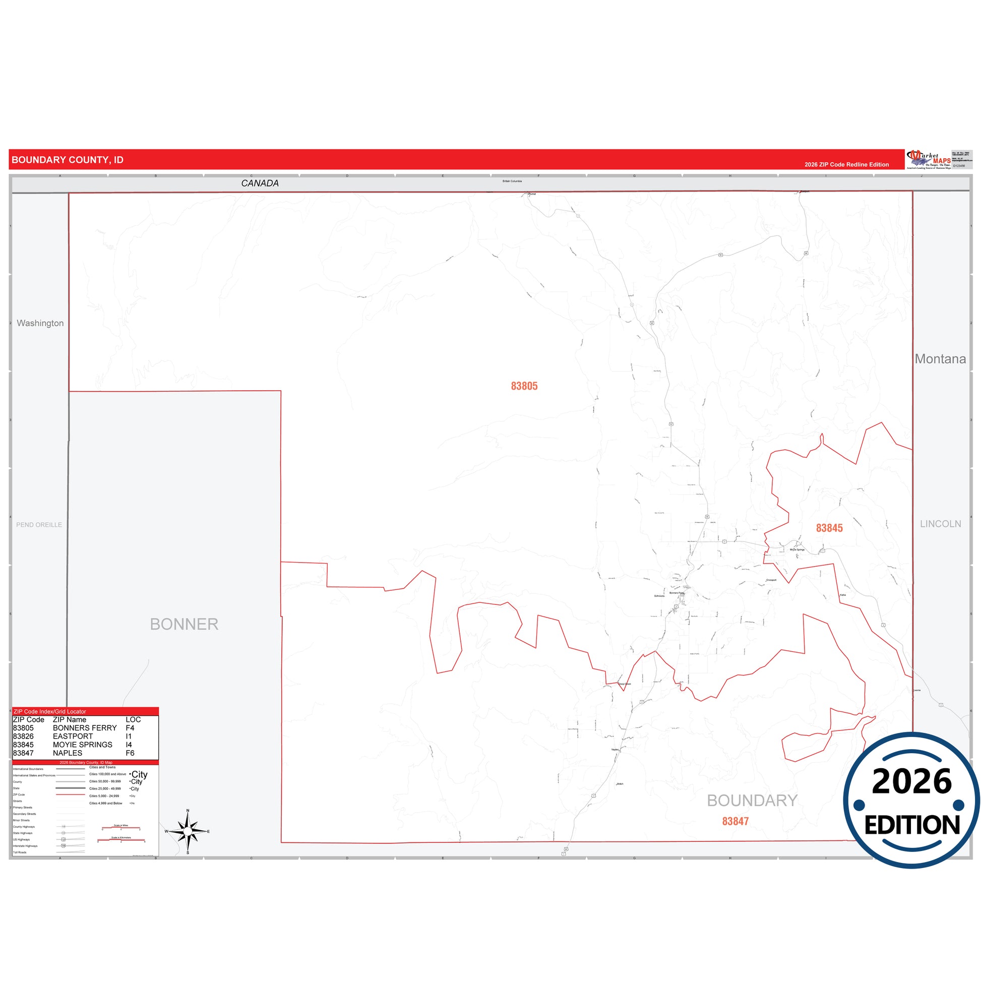 The RedLine Style map of Boundary County, ID shows ZIP code areas overlaid on a detailed road network of Boundary County, Idaho. Ideal for drawing locations, territories, and other applications. Base map features include all major streets and highways labeled, cities and towns, county and state boundaries, neighborhood names, railroads, and a clean white background suitable for marking and planning.