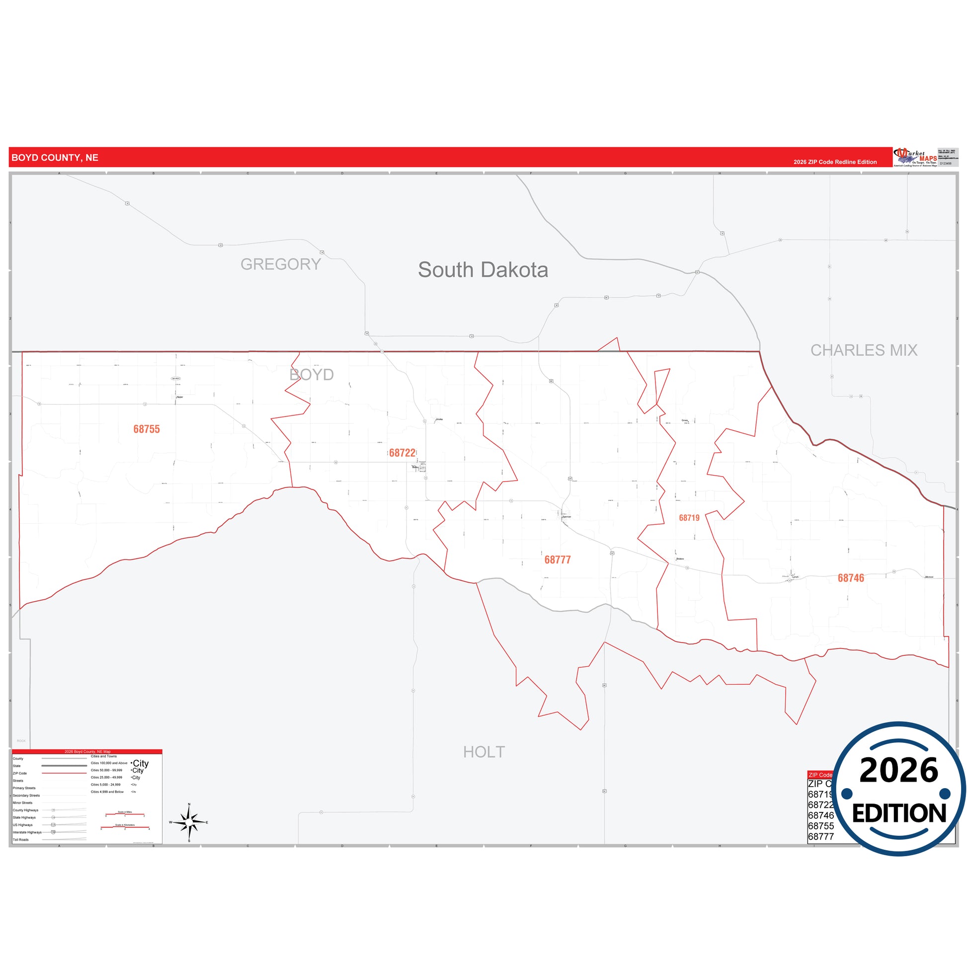 The RedLine Style map of Boyd County, NE shows ZIP code areas overlaid on a detailed road network of Boyd County, Nebraska. Ideal for drawing locations, territories, and other applications. Base map features include all major streets and highways labeled, cities and towns, county and state boundaries, neighborhood names, railroads, and a clean white background suitable for marking and planning.