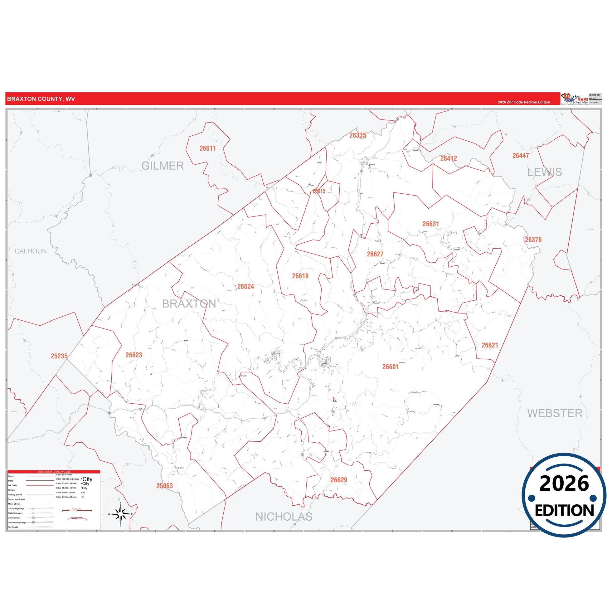 The RedLine Style map of Braxton County, WV shows ZIP code areas overlaid on a detailed road network of Braxton County, West Virginia. Ideal for drawing locations, territories, and other applications. Base map features include all major streets and highways labeled, cities and towns, county and state boundaries, neighborhood names, railroads, and a clean white background suitable for marking and planning.