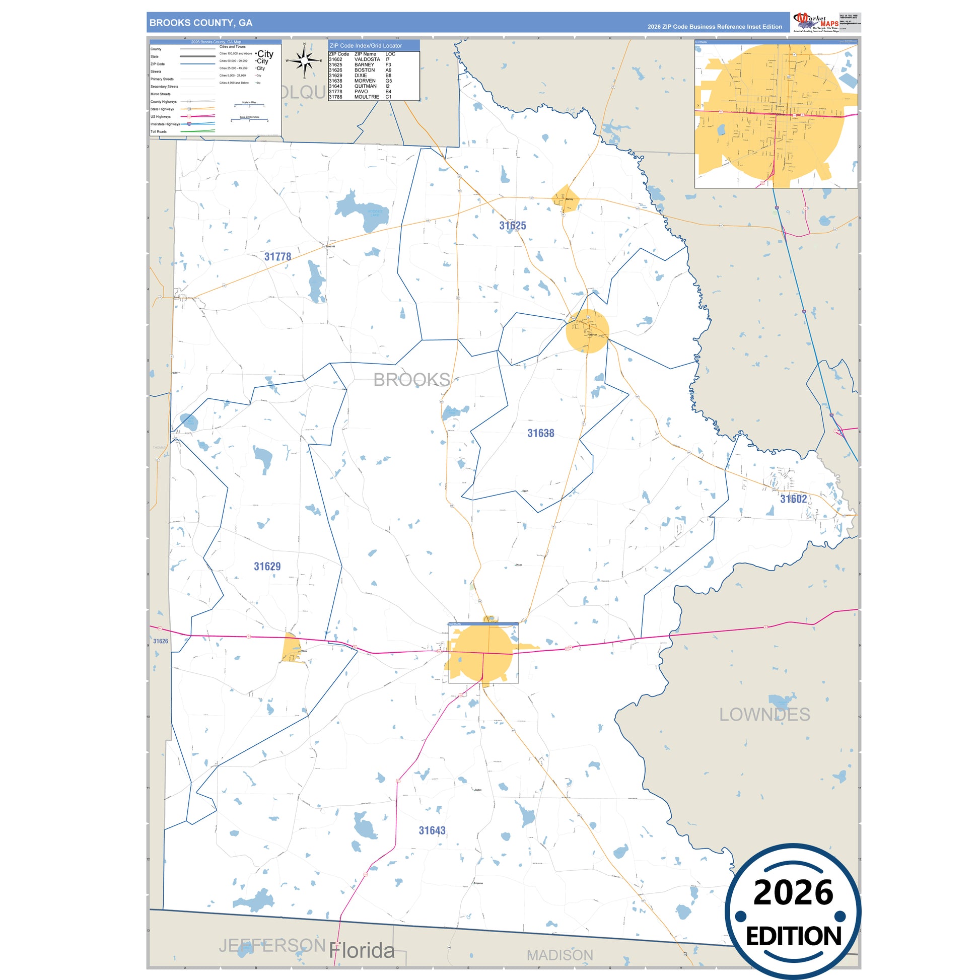 The Business Reference Style Brooks County, GA is a detailed map that includes all towns, cities, major roadways, and highways. Available in multiple wall map sizes, perfect for home, school, office, or business display.