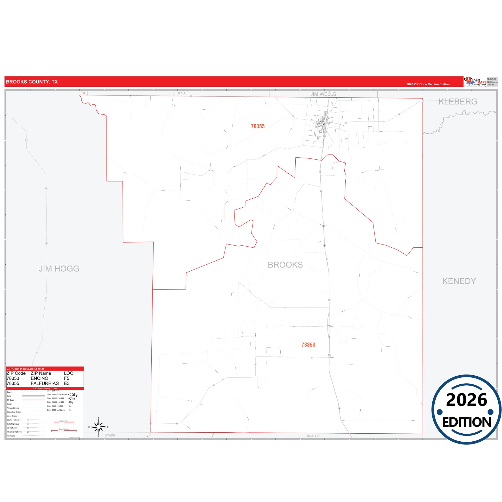 The RedLine Style map of Brooks County, TX shows ZIP code areas overlaid on a detailed road network of Brooks County, Texas. Ideal for drawing locations, territories, and other applications. Base map features include all major streets and highways labeled, cities and towns, county and state boundaries, neighborhood names, railroads, and a clean white background suitable for marking and planning.