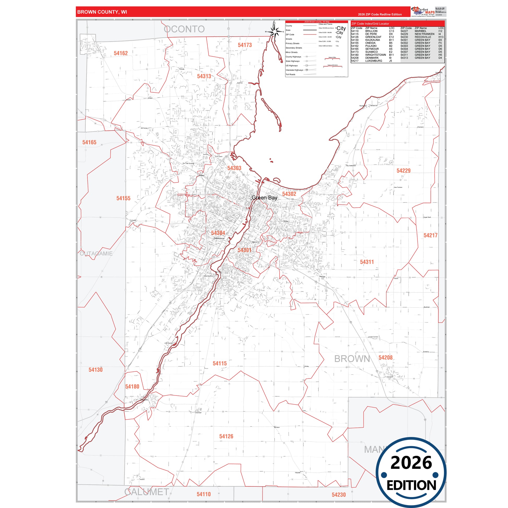 The RedLine Style map of Brown County, WI shows ZIP code areas overlaid on a detailed road network of Brown County, Wisconsin. Ideal for drawing locations, territories, and other applications. Base map features include all major streets and highways labeled, cities and towns, county and state boundaries, neighborhood names, railroads, and a clean white background suitable for marking and planning.