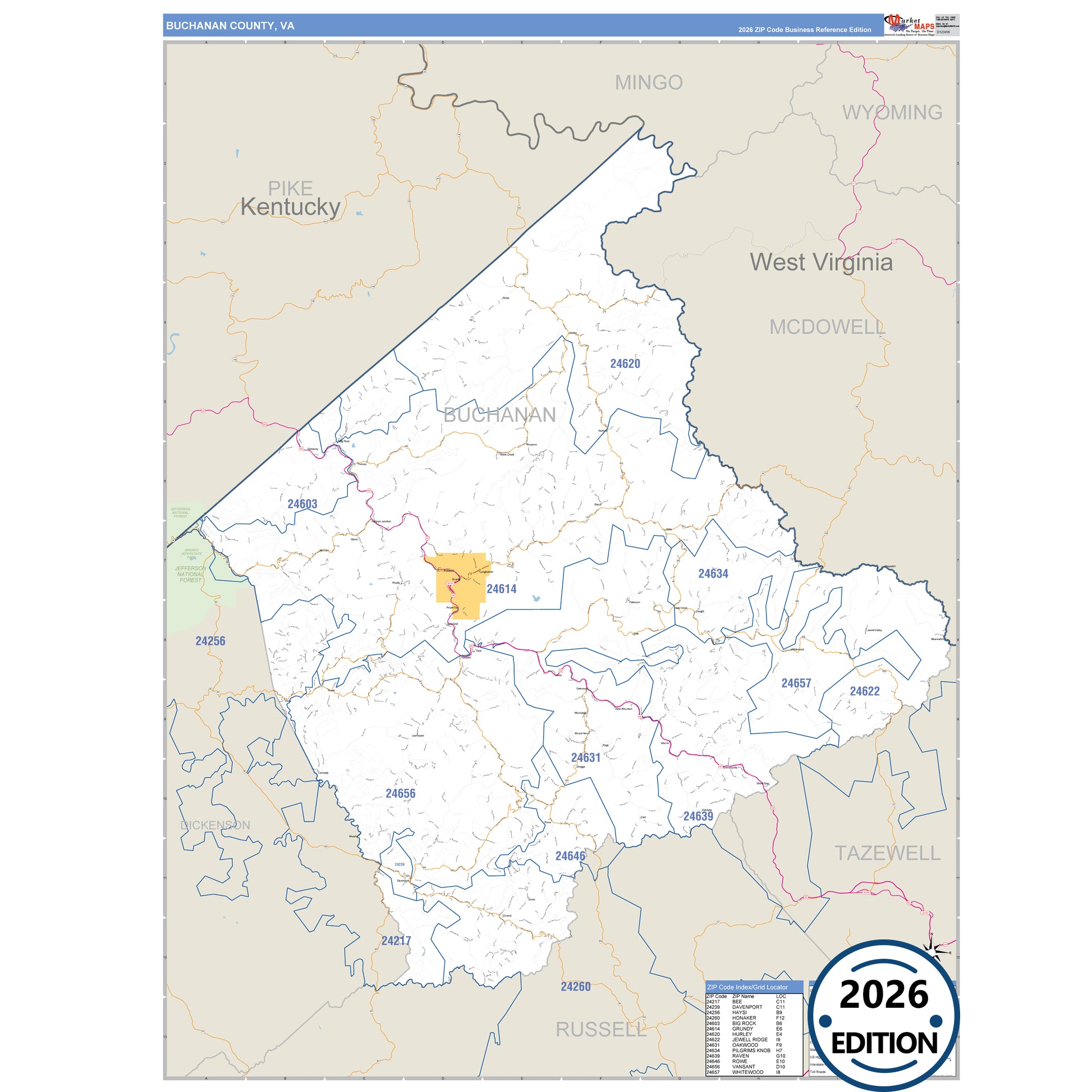 The Business Reference Style Buchanan County, VA is a detailed map that includes all towns, cities, major roadways, and highways. Available in multiple wall map sizes, perfect for home, school, office, or business display.