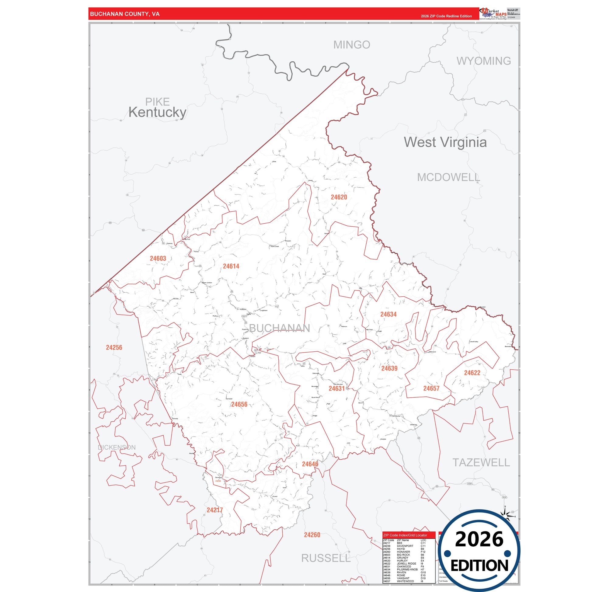 The RedLine Style map of Buchanan County, VA shows ZIP code areas overlaid on a detailed road network of Buchanan County, Virginia. Ideal for drawing locations, territories, and other applications. Base map features include all major streets and highways labeled, cities and towns, county and state boundaries, neighborhood names, railroads, and a clean white background suitable for marking and planning.