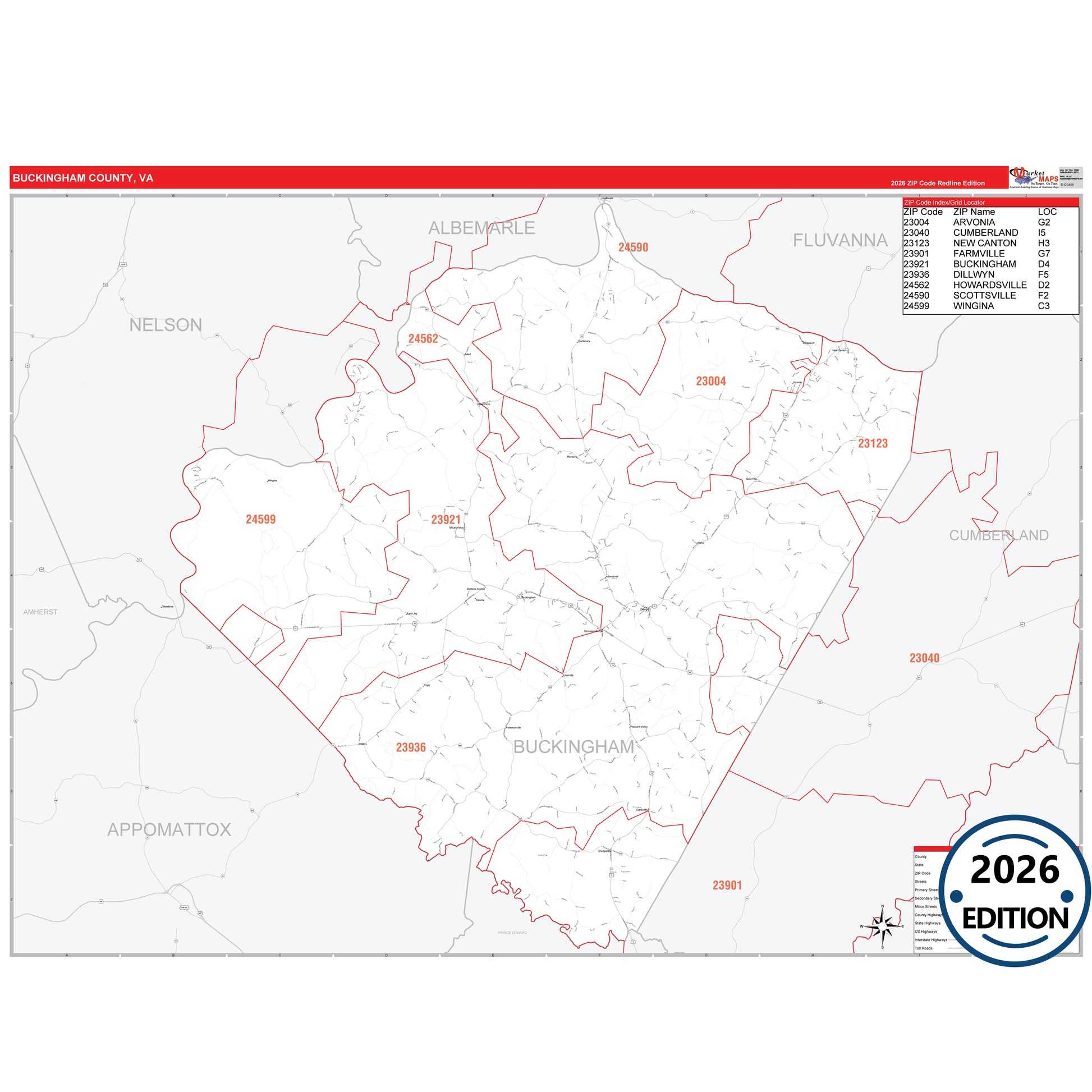 The RedLine Style map of Buckingham County, VA shows ZIP code areas overlaid on a detailed road network of Buckingham County, Virginia. Ideal for drawing locations, territories, and other applications. Base map features include all major streets and highways labeled, cities and towns, county and state boundaries, neighborhood names, railroads, and a clean white background suitable for marking and planning.