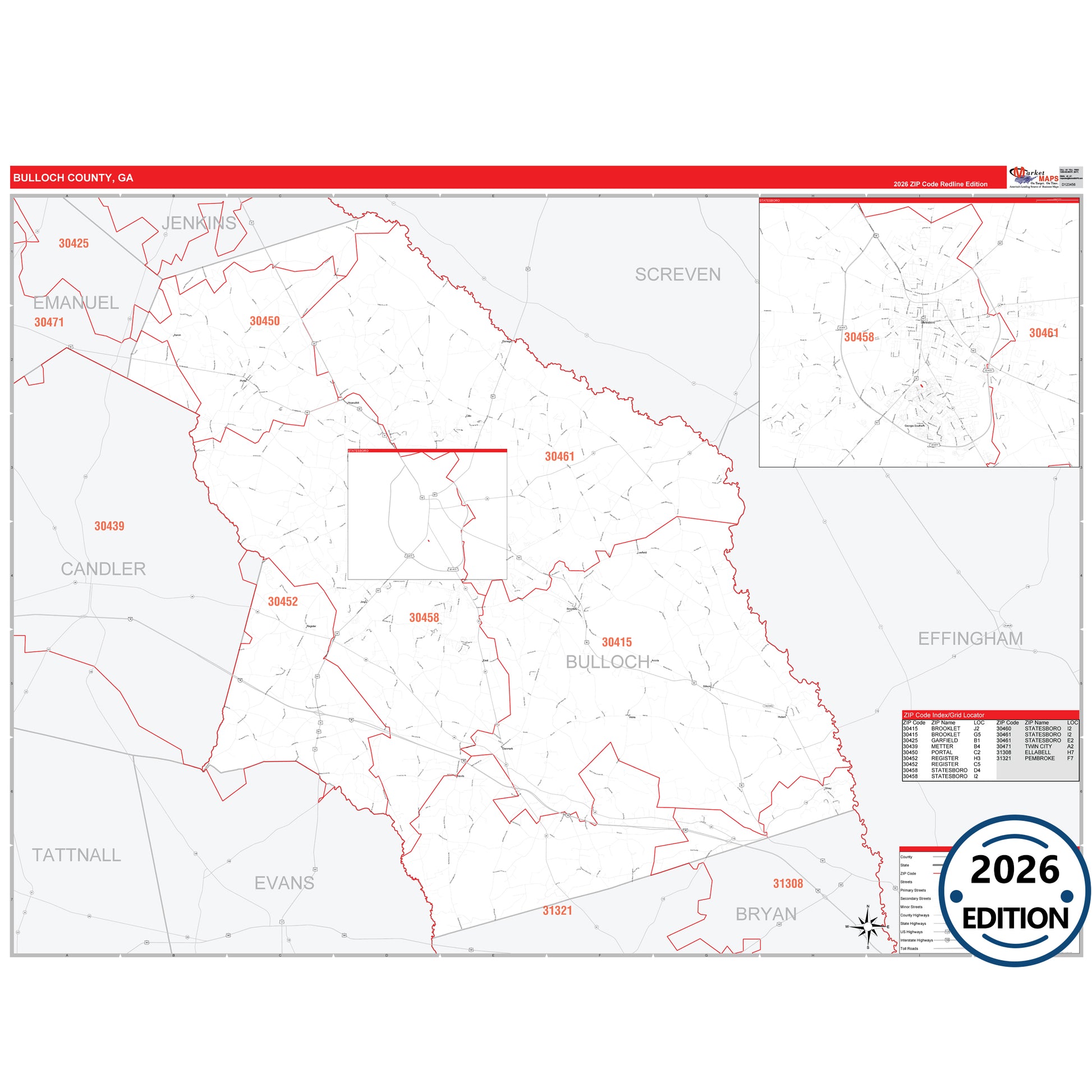 The RedLine Style map of Bulloch County, GA shows ZIP code areas overlaid on a detailed road network of Bulloch County, Georgia. Ideal for drawing locations, territories, and other applications. Base map features include all major streets and highways labeled, cities and towns, county and state boundaries, neighborhood names, railroads, and a clean white background suitable for marking and planning.