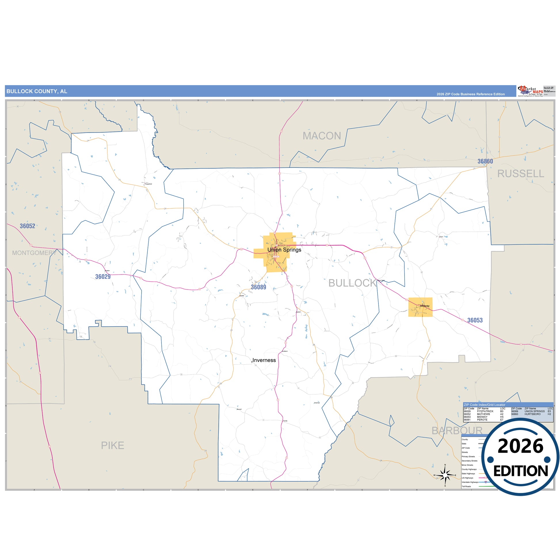 The Business Reference Style Bullock County, AL is a detailed map that includes all towns, cities, major roadways, and highways. Available in multiple wall map sizes, perfect for home, school, office, or business display.