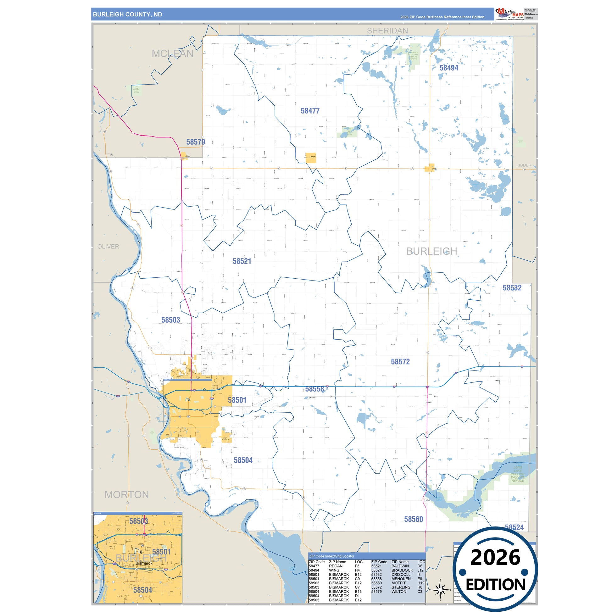 The Business Reference Style Burleigh County, ND is a detailed map that includes all towns, cities, major roadways, and highways. Available in multiple wall map sizes, perfect for home, school, office, or business display.