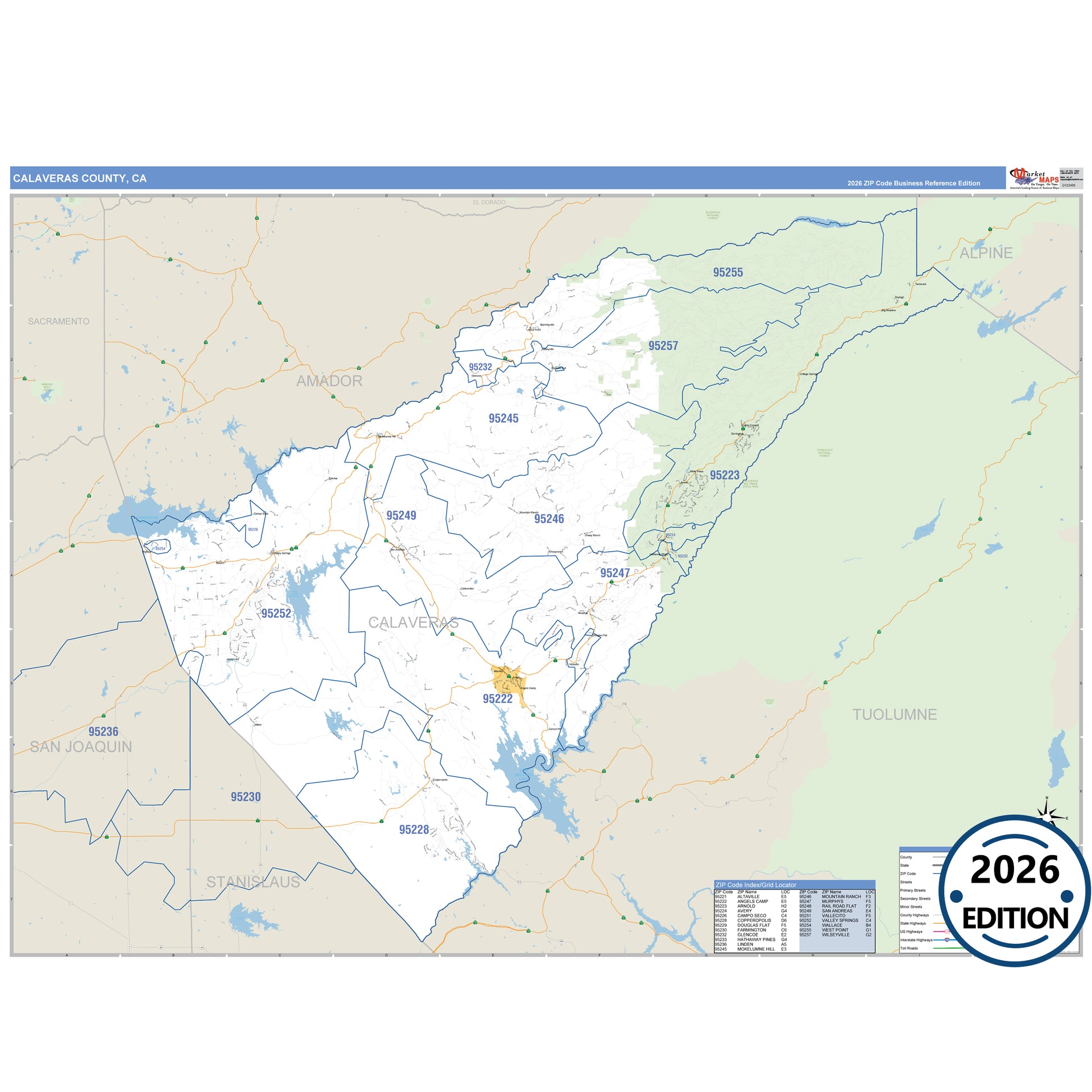 The Business Reference Style Calaveras County, CA is a detailed map that includes all towns, cities, major roadways, and highways. Available in multiple wall map sizes, perfect for home, school, office, or business display.
