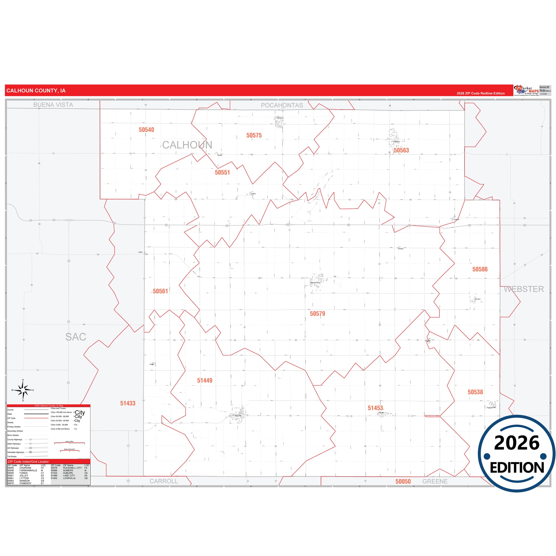 The RedLine Style map of Calhoun County, IA shows ZIP code areas overlaid on a detailed road network of Calhoun County, Iowa. Ideal for drawing locations, territories, and other applications. Base map features include all major streets and highways labeled, cities and towns, county and state boundaries, neighborhood names, railroads, and a clean white background suitable for marking and planning.