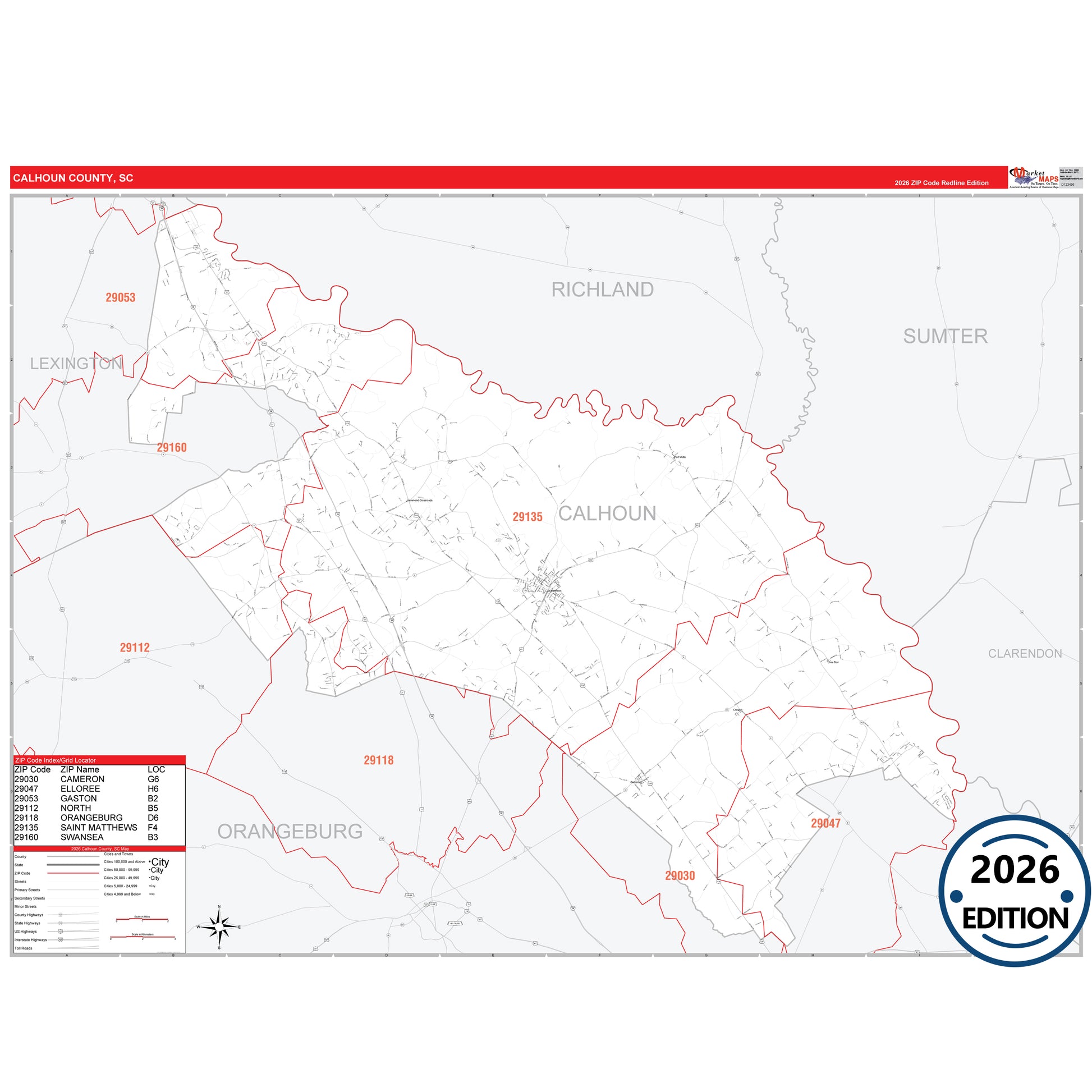 The RedLine Style map of Calhoun County, SC shows ZIP code areas overlaid on a detailed road network of Calhoun County, South Carolina. Ideal for drawing locations, territories, and other applications. Base map features include all major streets and highways labeled, cities and towns, county and state boundaries, neighborhood names, railroads, and a clean white background suitable for marking and planning.