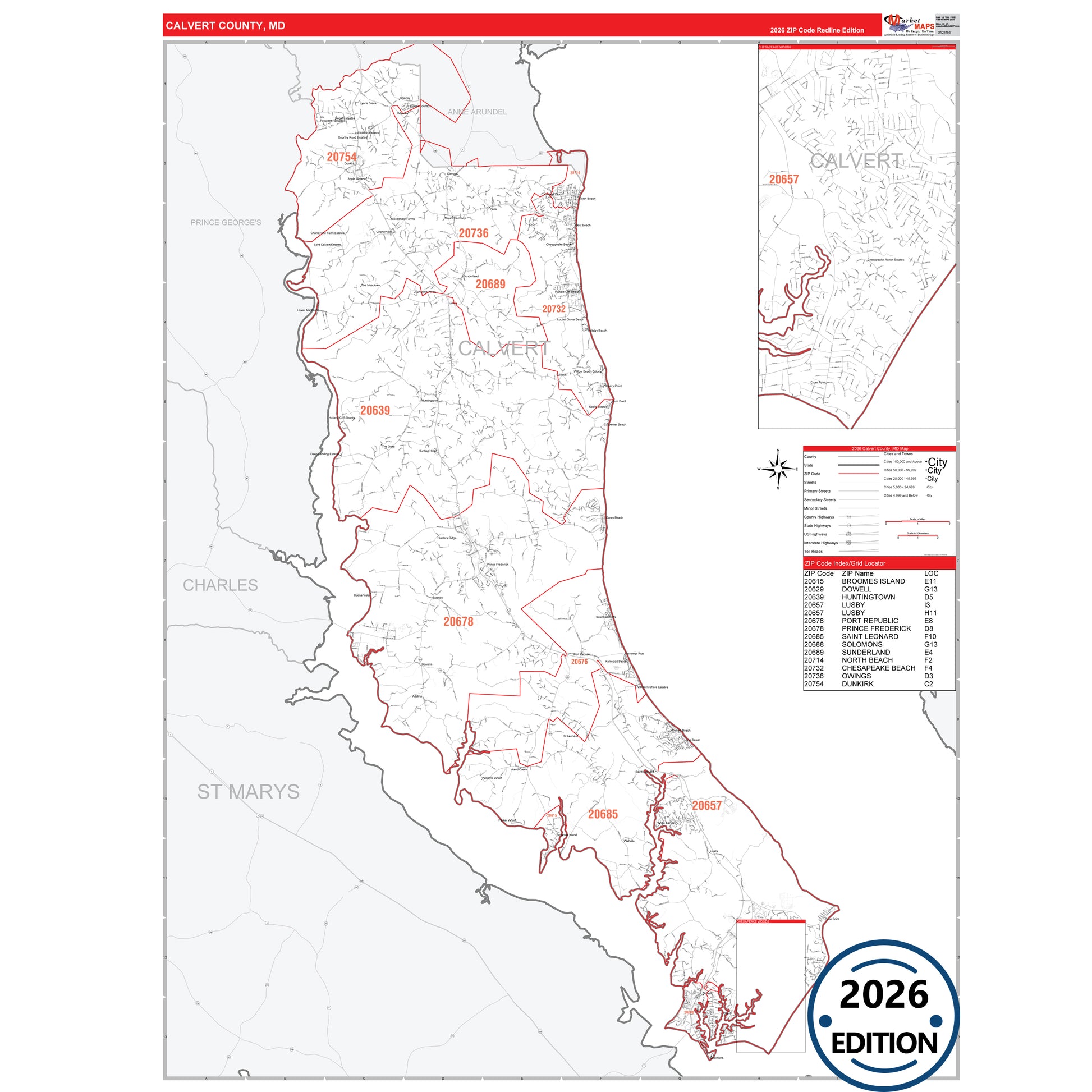 The RedLine Style map of Calvert County, MD shows ZIP code areas overlaid on a detailed road network of Calvert County, Maryland. Ideal for drawing locations, territories, and other applications. Base map features include all major streets and highways labeled, cities and towns, county and state boundaries, neighborhood names, railroads, and a clean white background suitable for marking and planning.