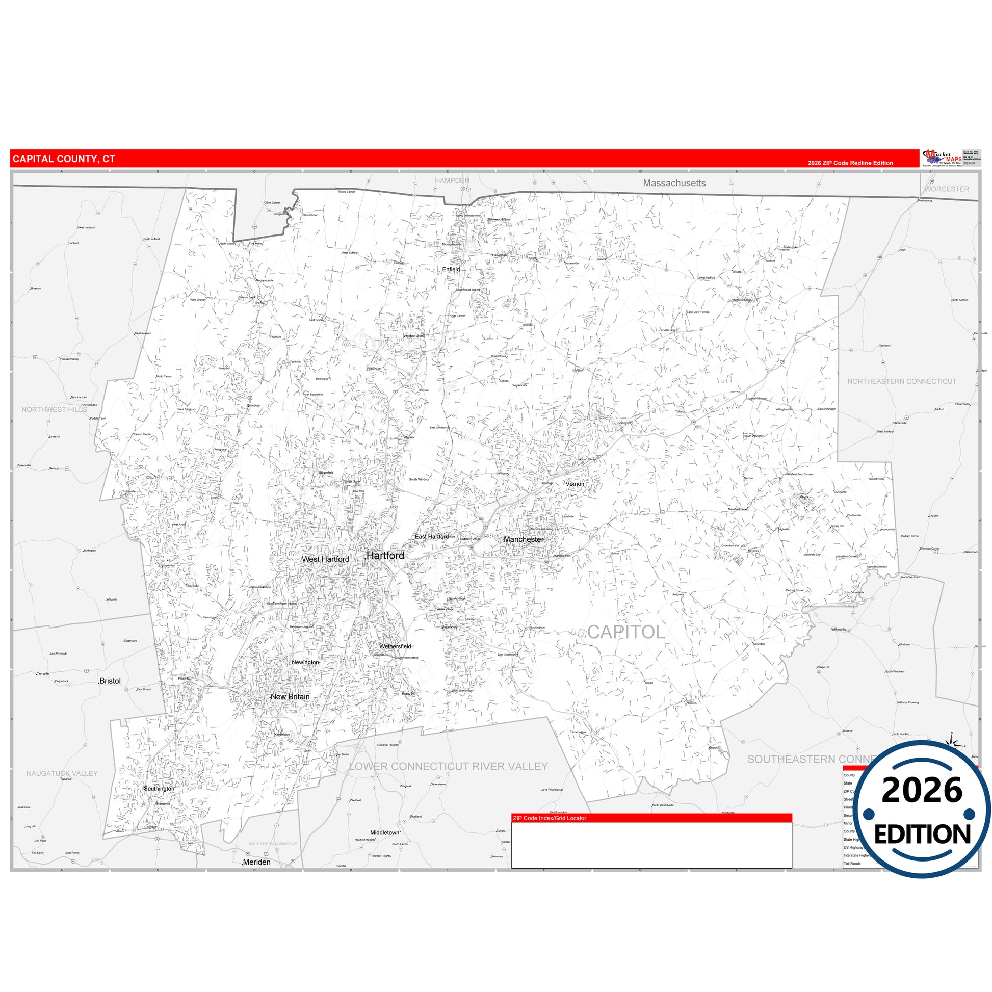 The RedLine Style map of Capitol County, CT shows ZIP code areas overlaid on a detailed road network of Capitol County, Connecticut. Ideal for drawing locations, territories, and other applications. Base map features include all major streets and highways labeled, cities and towns, county and state boundaries, neighborhood names, railroads, and a clean white background suitable for marking and planning.