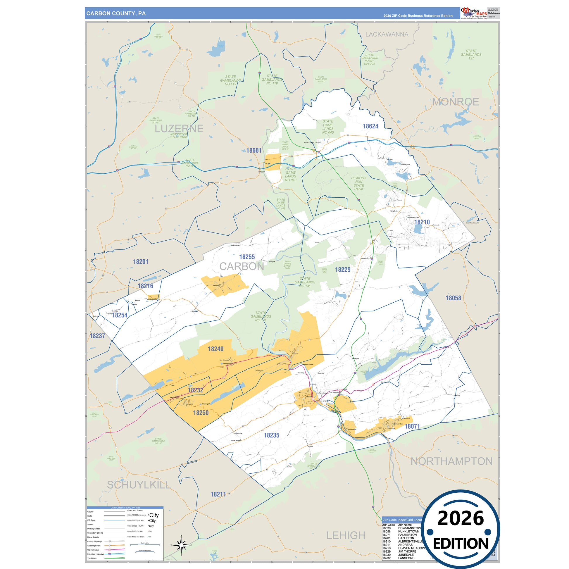 The Business Reference Style Carbon County, PA is a detailed map that includes all towns, cities, major roadways, and highways. Available in multiple wall map sizes, perfect for home, school, office, or business display.