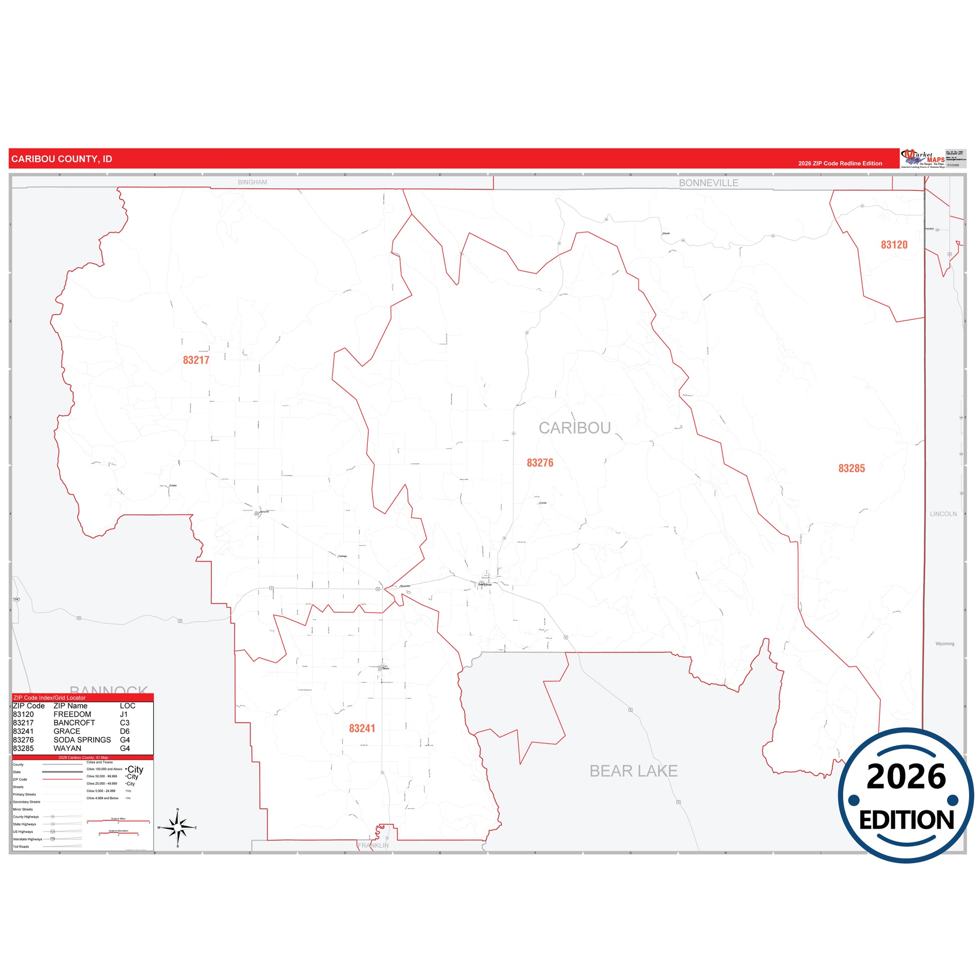 The RedLine Style map of Caribou County, ID shows ZIP code areas overlaid on a detailed road network of Caribou County, Idaho. Ideal for drawing locations, territories, and other applications. Base map features include all major streets and highways labeled, cities and towns, county and state boundaries, neighborhood names, railroads, and a clean white background suitable for marking and planning.