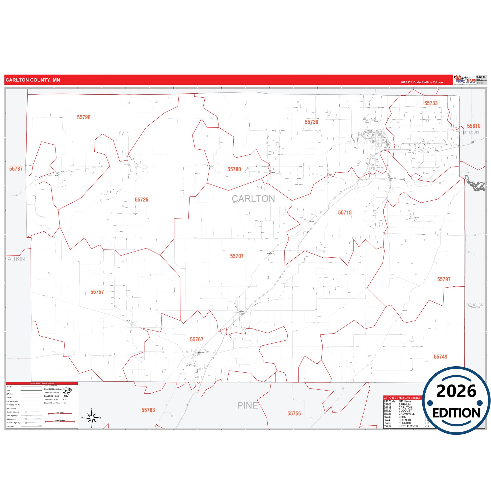 The RedLine Style map of Carlton County, MN shows ZIP code areas overlaid on a detailed road network of Carlton County, Minnesota. Ideal for drawing locations, territories, and other applications. Base map features include all major streets and highways labeled, cities and towns, county and state boundaries, neighborhood names, railroads, and a clean white background suitable for marking and planning.